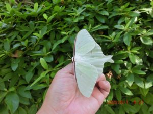 今回はオオミズアオという大型の蛾です。 ある初夏の朝、植え込み近くの地面に薄緑色の翅を大きく広げたオオミズアオが止まっていました。そこで、手乗りを試みたものがこの写真です。手にズシリと重さを感じました。 オオミズアオはい […]