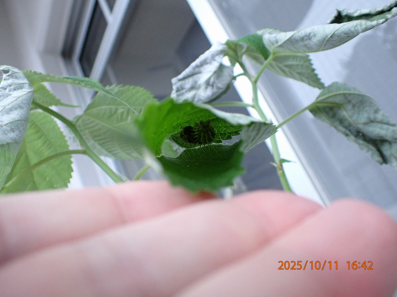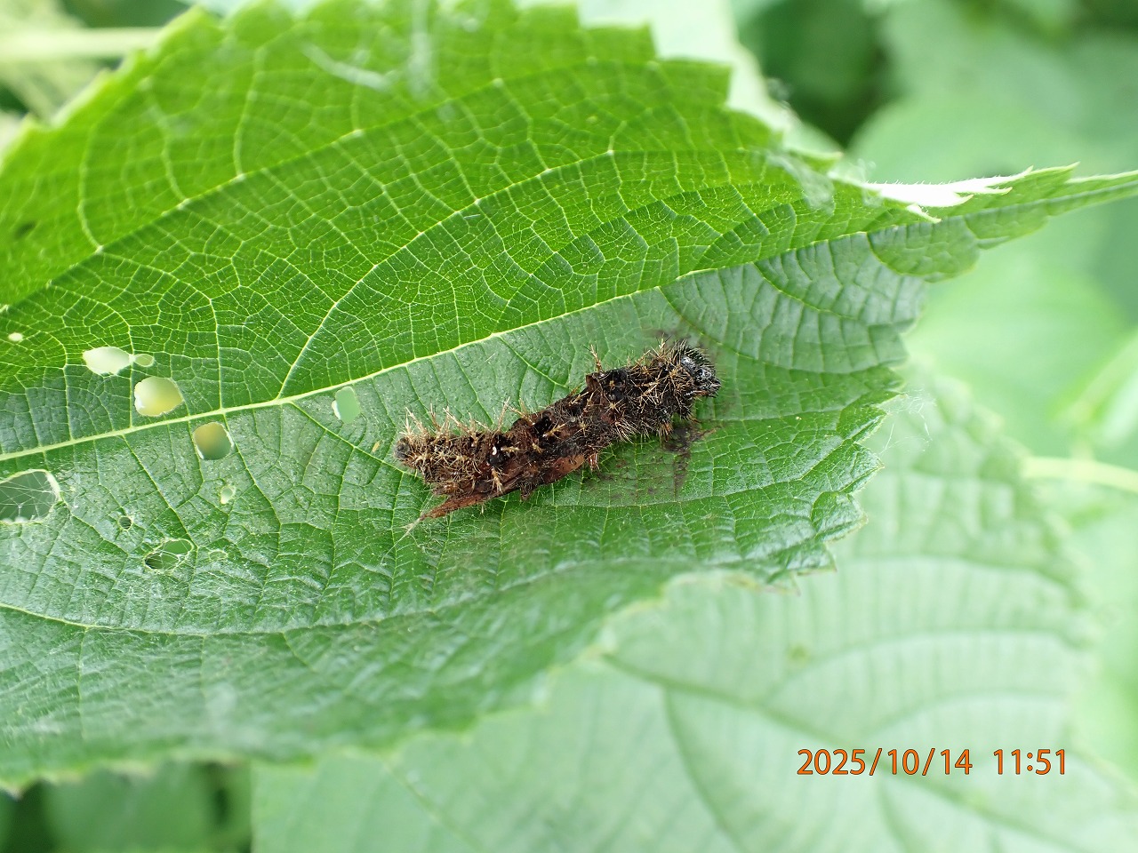 幼虫は葉の表の中央にいて葉の左右両端に交互に糸をつける作業を延々と行い、その連結した糸を徐々に短くしていくと葉の両端が次第に縮まり、最後には両端がくっ付いて、幼虫がその中で暮らす餃子型の巣が完成する。そうやって苦労して作った巣だが、そっと開いてみると確かにトゲトゲのある黒っぽい幼虫がいる。もちろん、大きくなるたびに巣を作り替えるので、すでに空き家になったものもある。また2枚目の写真のように幼虫が途中で死んでしまっているものもある。運が良ければ、中で幼虫がさなぎになって逆さまにぶら下がっているものも見つかる。