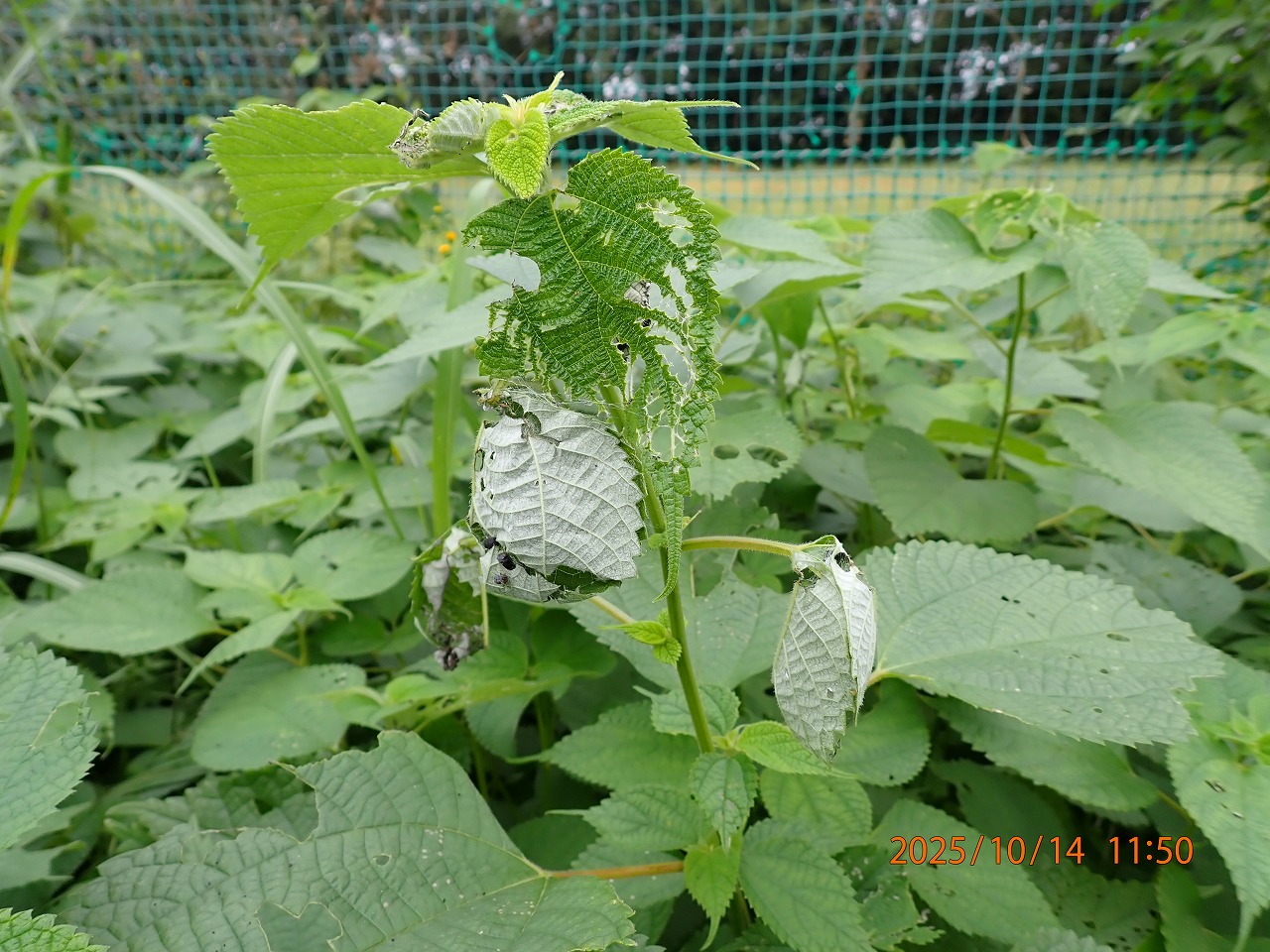 多摩川の土手沿いには所どころカラムシの群落がある。その群落を見ると緑の葉に混じって遠くからでもよく目立つ白い葉裏を返した餃子のような形のものがいくつもついている。これはアカタテハの幼虫が自ら作った巣なのだ。