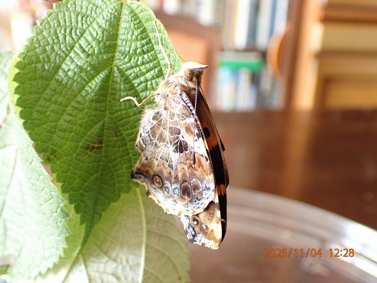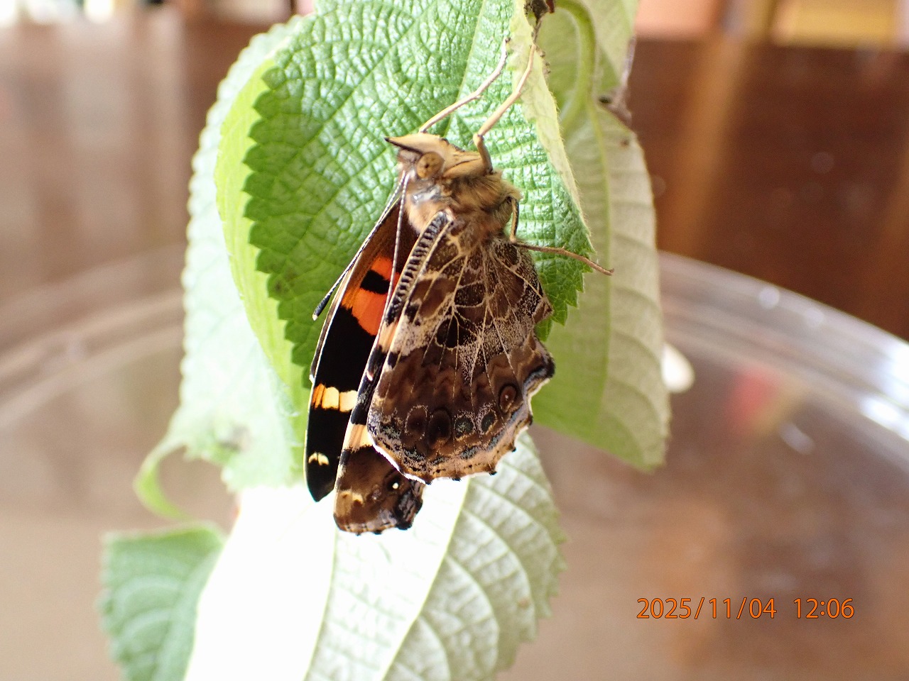 これまでも羽化の瞬間を撮ろうと何度も挑戦していたが、蛹の殻が割れて体が出てくるところはなかなか捉えられない。蛹の外からも中の翅の模様が透かして見え始め羽化が間近なのは分かってはいてもだ。というのも、アカタテハの蛹はカラムシの葉で作った巣の中にいるので、葉が邪魔で直接見るのはちょっと難しい。ということで、いつものことだが、気が付いた時には既にその巣から巧妙に這い出して完全に巣の外に出て縮まった翅を伸ばし始めている。この間、わずか数十秒のことなのだが、どうもうまく捉えきれないのだ。今回もそうだった。