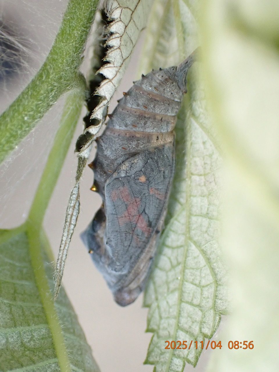 この日の朝、蛹の外からも翅の赤い模様が透けて見えだした。ただし、これは、そっと巣を開いて撮影したもので、そのままだと巣の中は直接は見られない。