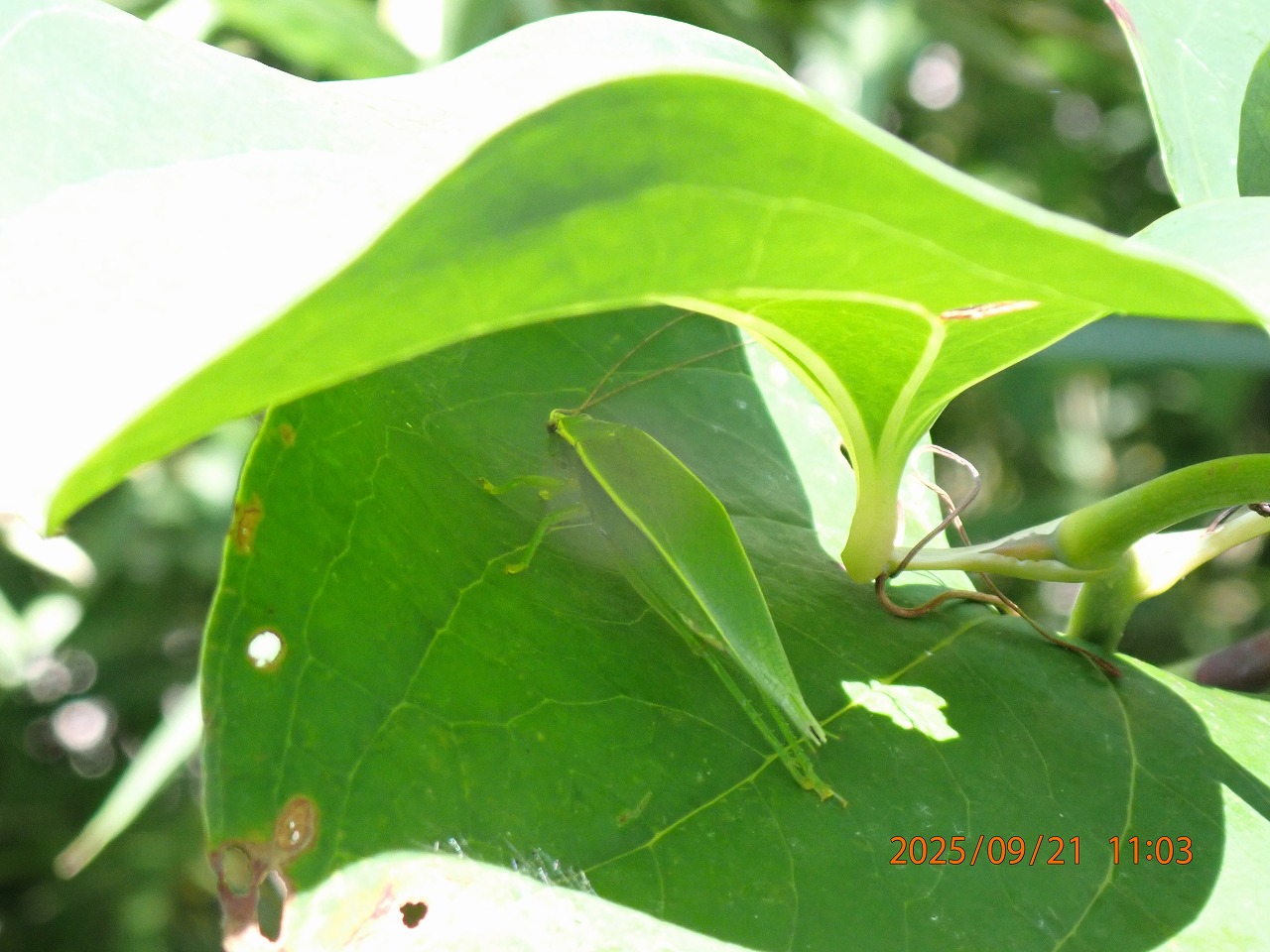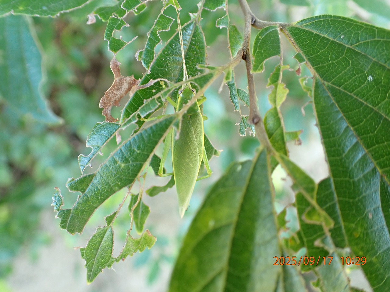 因みに、これは生田緑地で見つけたアオマツムシ。昼間はこうして葉陰に潜んでいる。