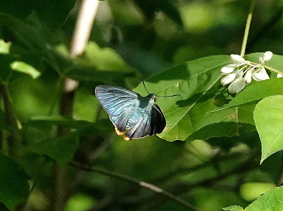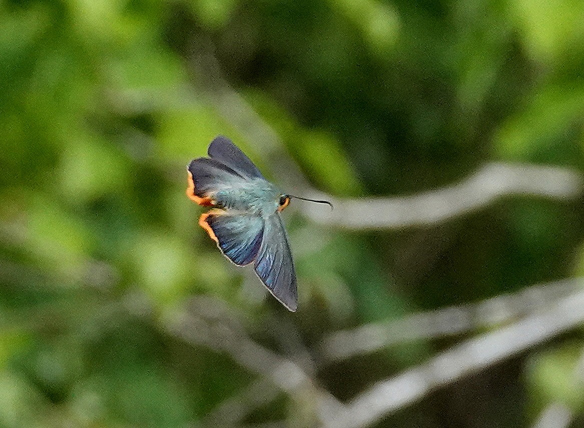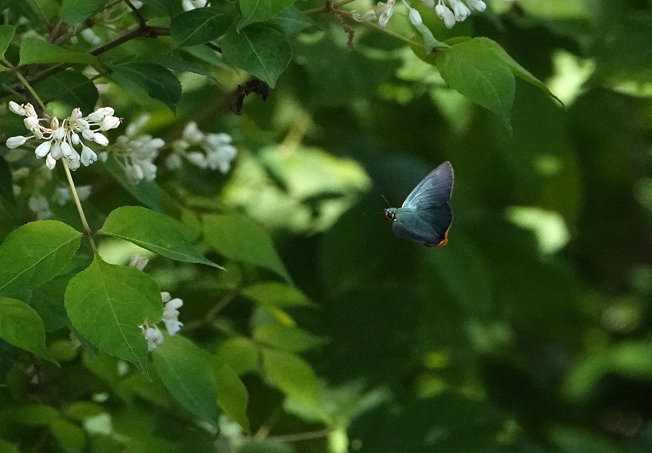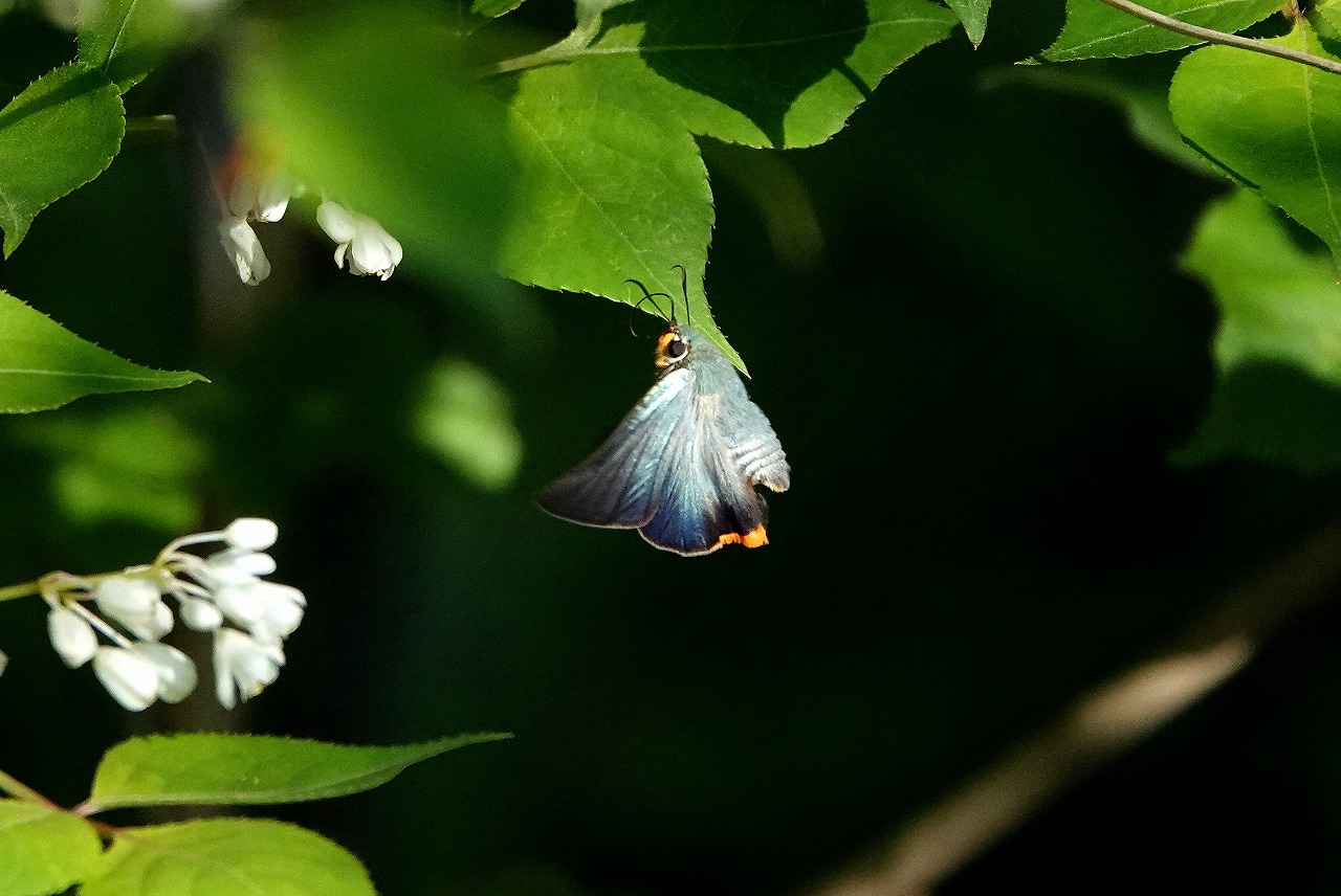 とにかく気まぐれに飛び回り、花にいきなり接近、吸蜜したかと思うとすぐ離れるのでアオバセセリの飛翔写真はなかなかハードルが高い。吸蜜の前後では急激に減速するのでなんとか対応できるが、テリ張り(オスが自分の縄張りに入ってくる他のオス、その他のあらゆる生きものが入ってくると猛追して追い出す行動)にからむ飛翔の場合はさらに厳しい。