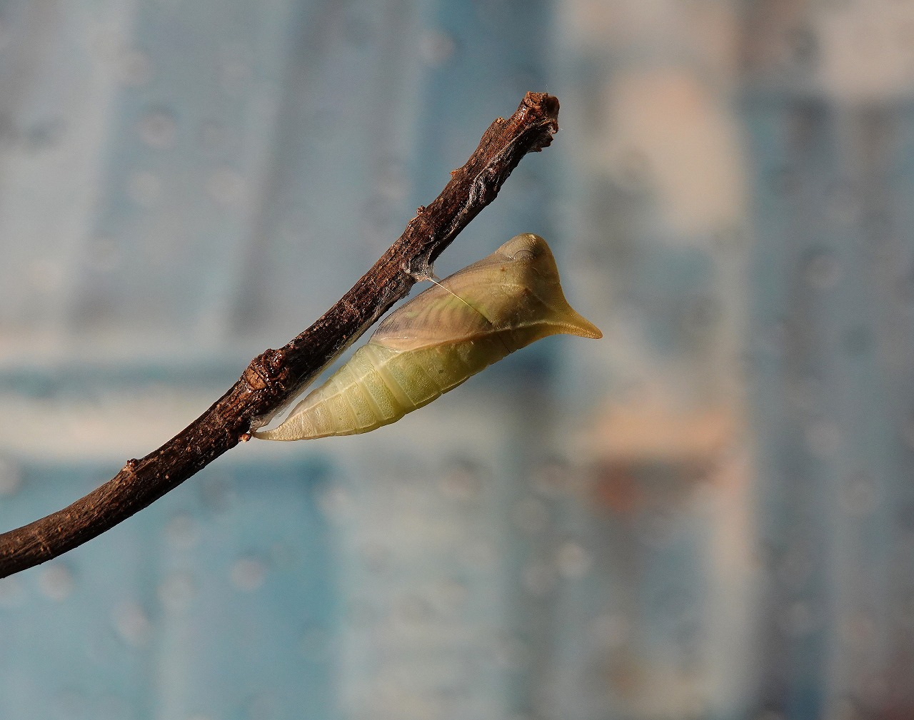 薄緑の蛹の表面が透けて翅の模様が見え出すと羽化は時間の問題となってくる。夜、かなり模様がはっきりしてきたので、カメラを据えて、もし運良く明日の朝にまだ羽化してなかったら動画を撮ってやろうと決めて就寝。朝5時頃起きて確認すると、やった!まだ羽化してない! ということで睨めっこしながらその瞬間を待つ。