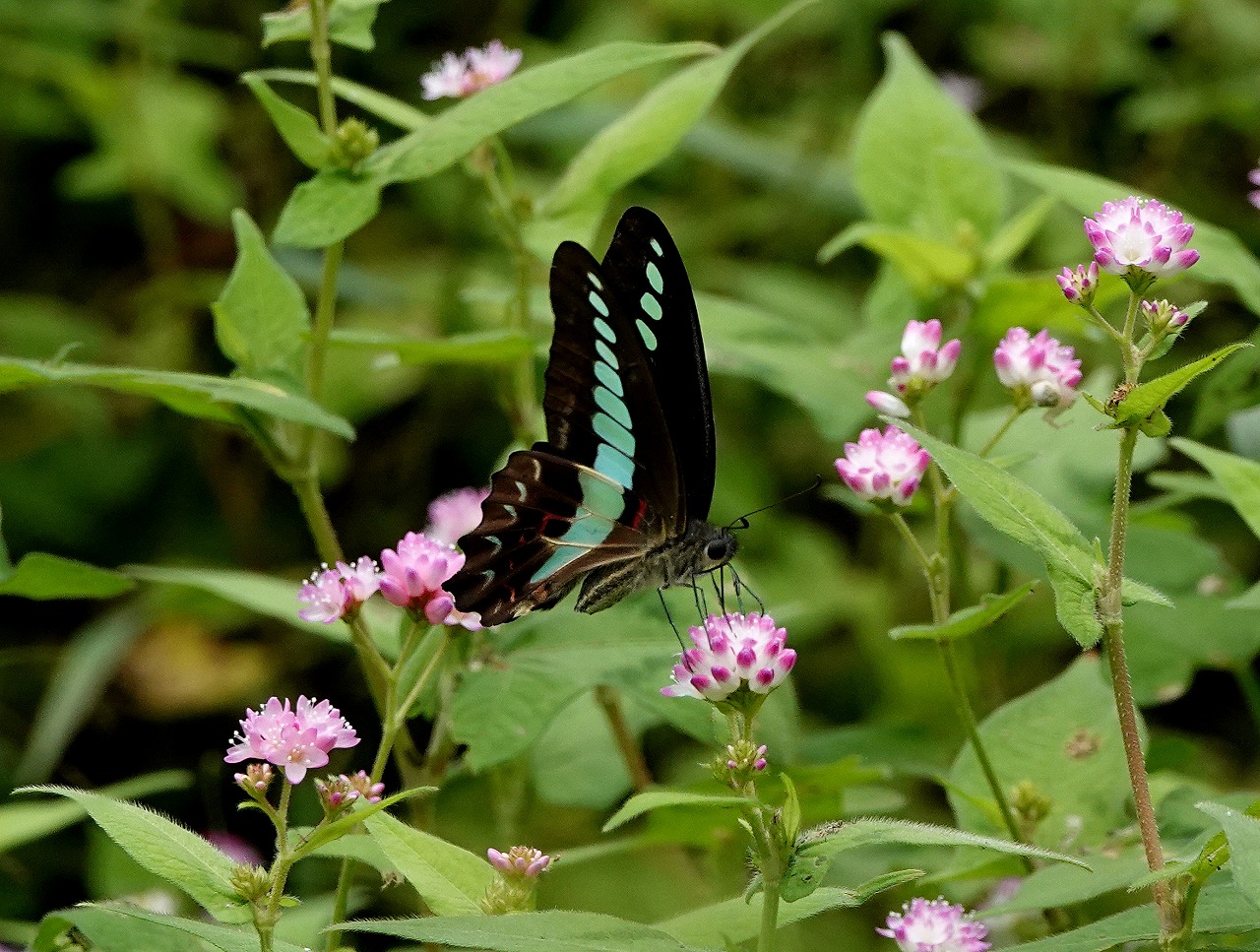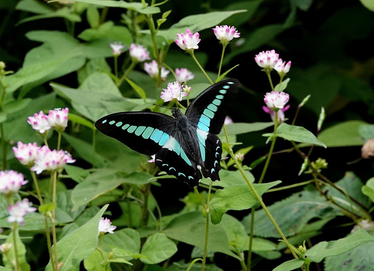 生田緑地の湿地帯にミゾソバとツリフネソウが咲き誇っている。ピンクの海にひと際目立つアオスジアゲハが現れた。吸蜜以外では飛ぶのが速すぎてとても撮影にはおぼつかないが訪花時は比較的ゆっくりであるうえに近くの花に移動することが多いのでいいチャンスになる。前回のホシホウジャクはツリフネソウ専門でミゾソバには来ないが、アオスジアゲハの場合はこの逆でミゾソバのみ選んで訪花している。