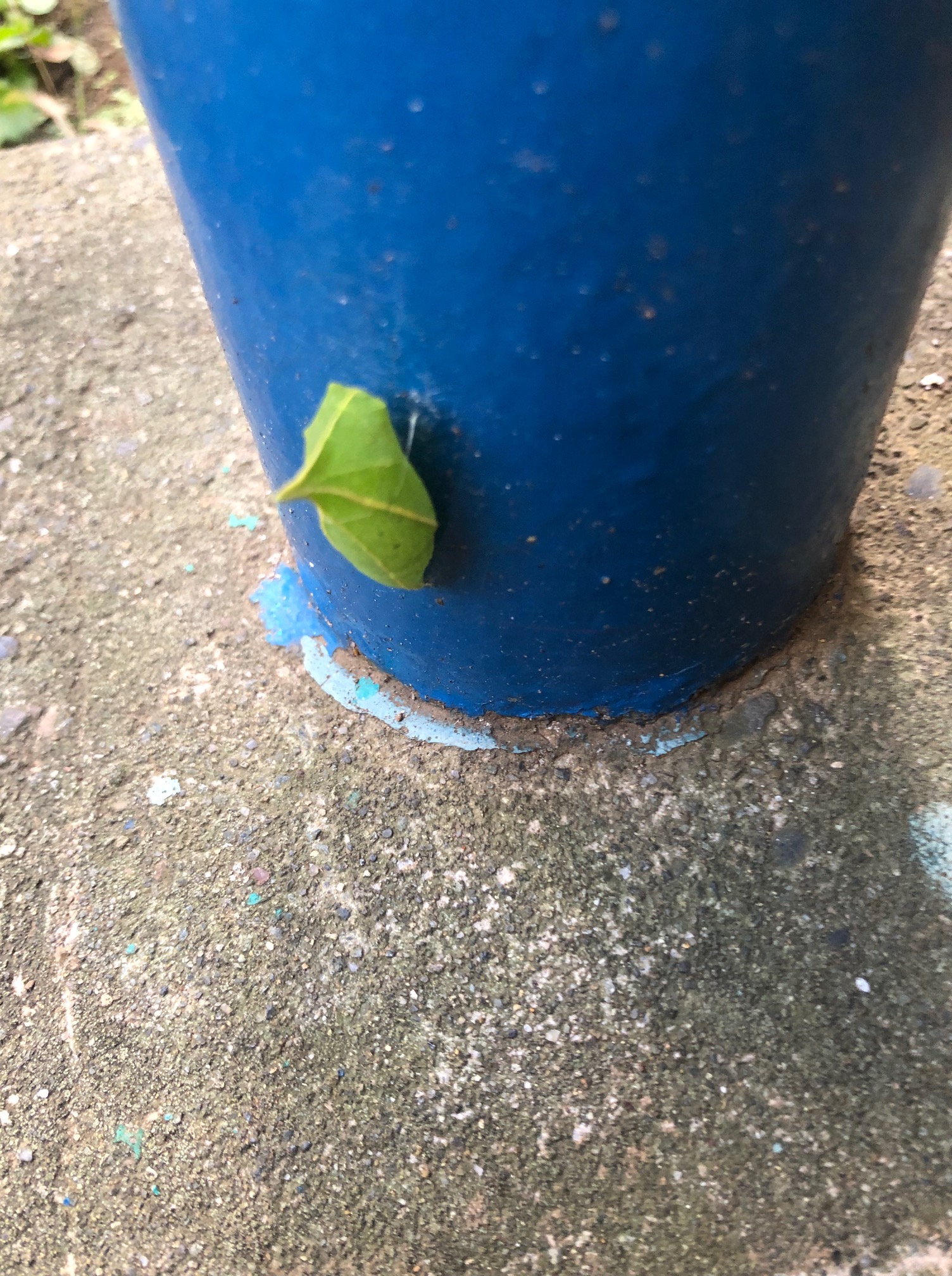 これは奇妙な2例目の蛹であるが、またもやアオスジアゲハが植樹のクスノキを離れて人工物の青くペンキを塗られた鉄製のポールで蛹になっているのを見つけた。前回の例は「アオスジアゲハの羽化」で書いたように、今回と同様の鉄製のポールで蛹になっていたが、この場合はすぐそばにクスノキがあったので、何かの拍子に地上に落下して、手っ取り早い近くの場所で蛹になったと考えられなくもなかった。今回の例は少し事情が違いクスノキからは20m以上も離れているし、その間には人の歩く通路やいろいろな植え込みなどもある。にも拘わらず、そこまでわざわざ地面を這って、人にも踏まれず、鳥にも捕食されずに運よく辿り着いたということだ。しかし、蛹になったのは地面から僅か5㎝足らずというあまりにも低い所だったことから、日々の掃除の時に思わぬ事故に会いかねないので、お節介ながら急遽保護することにした。今飼育箱にいて羽化を待っている。しかし、なぜこのような目立つ場所で、しかも地上すれすれの場所を選んで蛹になるのか大いに疑問だ。折角のクスノキの葉に擬態しているのが全く意味をなさない。
