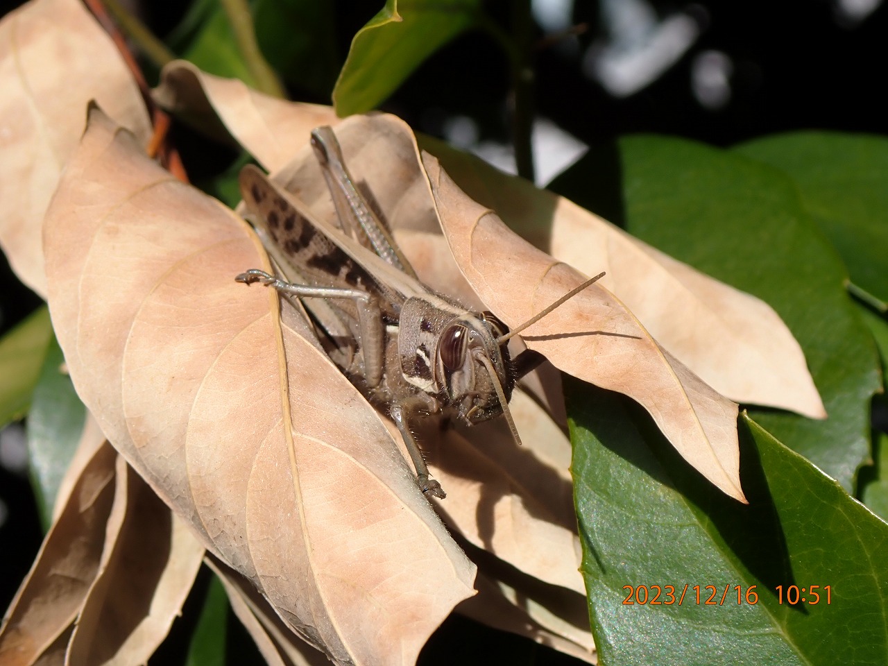 これはツチイナゴという種類で、日本では唯一の冬場に活動するバッタであるということ。そして、このツチイナゴは何とイネ科の植物は食べないというバッタとしては変わり者らしく、食草はクズ・カナムグラなどだということ。調べた情報では食草にアラカシまでは記載されていませんでしたが、固いアラカシの葉を無心に食べるさまはとても印象的でした。一つ勉強になった・・・。そう言えば、秋にはあれほどたくさんいたバッタも12月ともなると全く姿を見なくなっていましたね。
