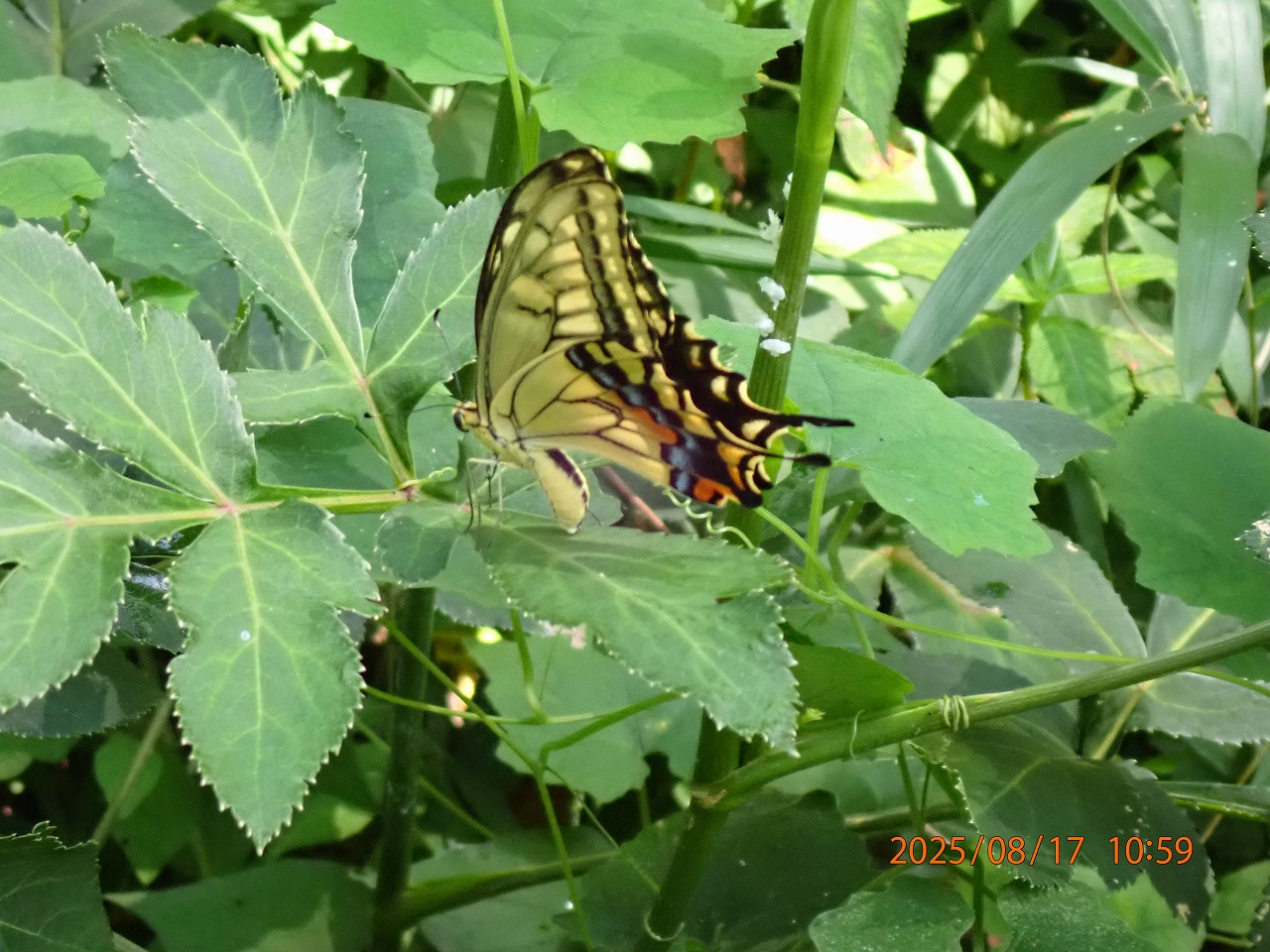 この日、汗だくになって生田緑地を約1時間半歩き回ったが飛ぶチョウはほんの数えるくらいしかいなかった。そんな手持無沙汰と優に30℃を越える暑さに聊かうんざりしていた矢先にきれいなキアゲハと巡り合った。そのチョウは何かを探しているようで、そのあたりを行ったり来たりしている。どうも産卵場所を探しているメスのようだった。そこで、しばらく様子を見ていると、ある植物に何度も接触して、ついに腹を曲げ産卵の姿勢に入った。