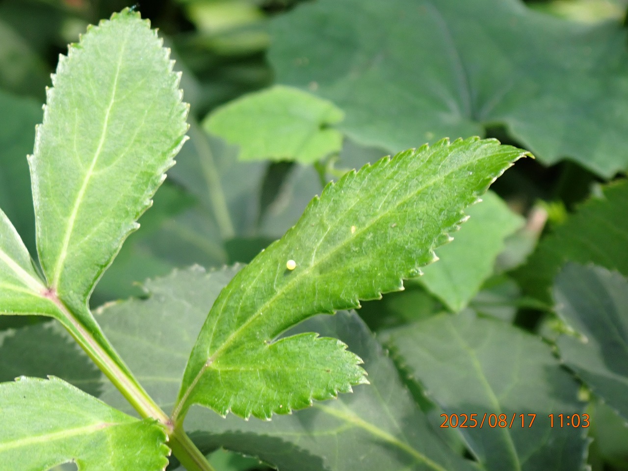 春のキアゲハは多摩川河川敷ではハナウドに産卵し、今年も何頭も卵から飼育したのでよく分かっている。しかし、夏になるとハナウドは葉を落してしまう。一体キアゲハの次世代は何を食草に選んでいるのかよく分からないでいただけに、この日の出会いは非常に興味深かった。夏場にはアシタバという手があったのか・・・。セリ科と言ってもセリ・ミツバ・パセリ・フェンネルなどいくらでもあるが、自然界にあるセリ科の植物の中で大食漢の幼虫の食欲を十分満たせそうな植物がそう簡単に頭に浮かばなかったのだ。そんな具合で、今日のアシタバでの産卵は私自身にとってはとても新鮮な発見で驚きでもあった。それが分かってから、付近にあるアシタバを探してみると、確かにあちこちに丸い卵が産み付けられていた。ただ、幼虫はまだ見られなかったが、これからの観察が楽しみだ。