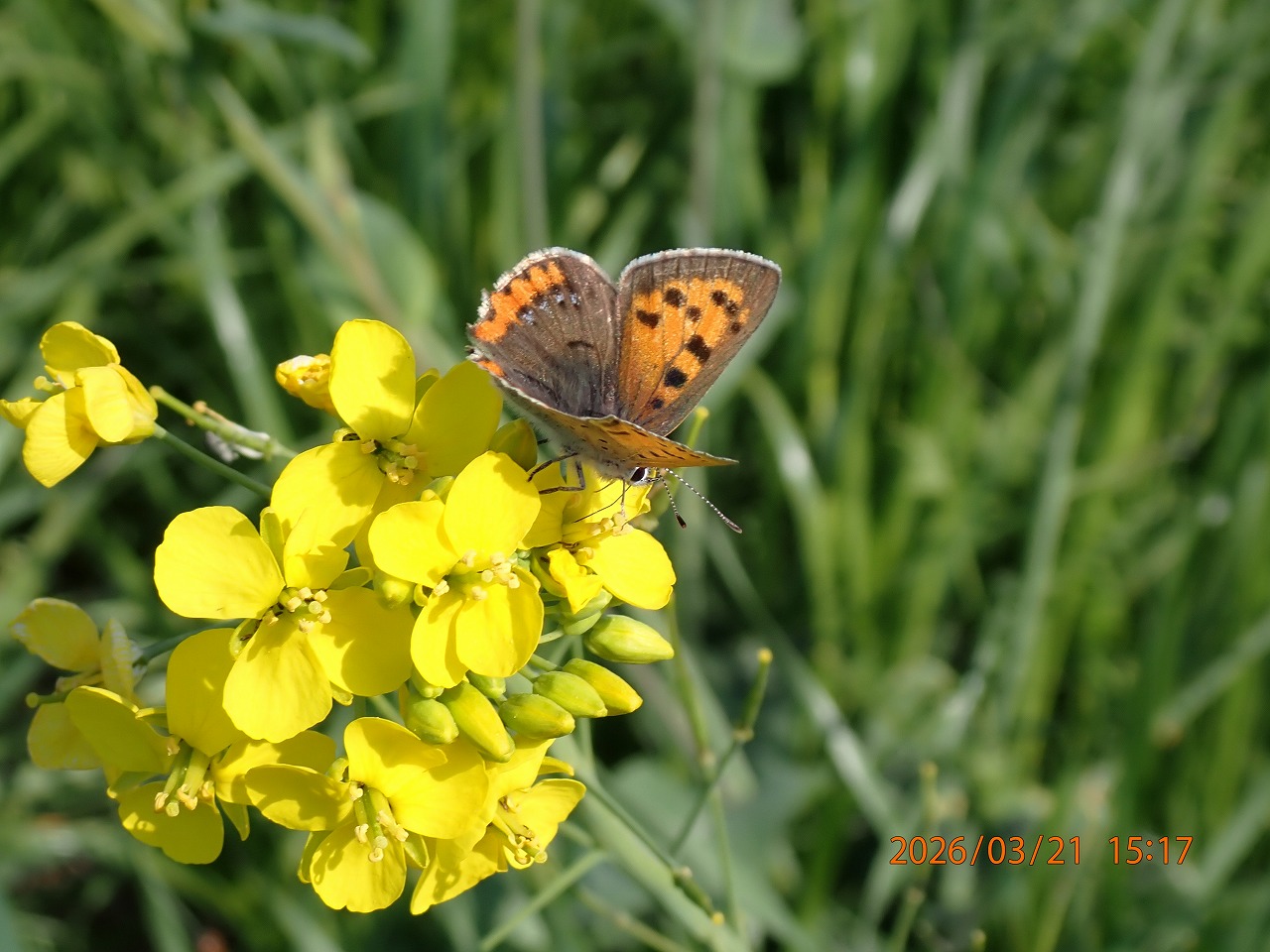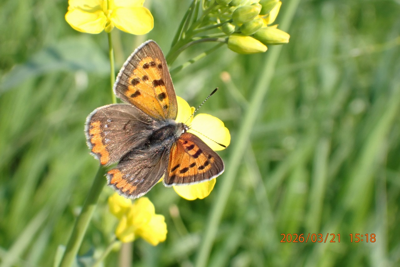 これが今年のベニシジミの初めての写真です。約2週間ほど前にベニシジミも今年初めて見てはいたが、その時は残念ながら写真に収めることはできなかった。止まる花もまだ少なかったこともあり、しきりにあたりを飛びまわるだけで、結局シャッターチャンスを逃してしまっていた。しかし、今回は菜の花が咲いていたので時々止まってくれて、撮ることができた。よく見ると羽化からはかなり時間がたっていると見られ、おそらく2週間前に見たのと同時期に羽化していたのではなかろうか。