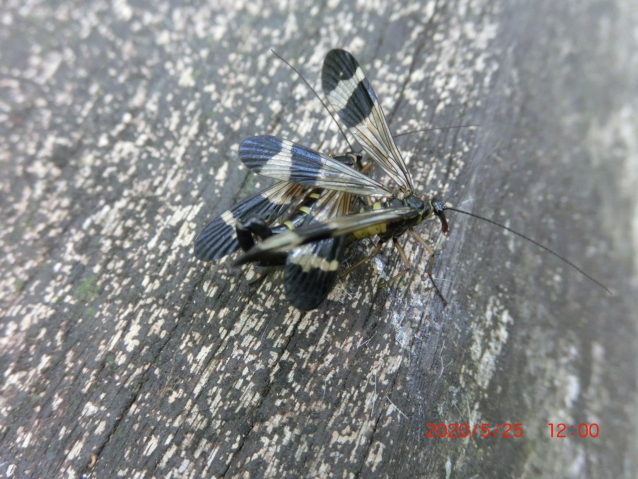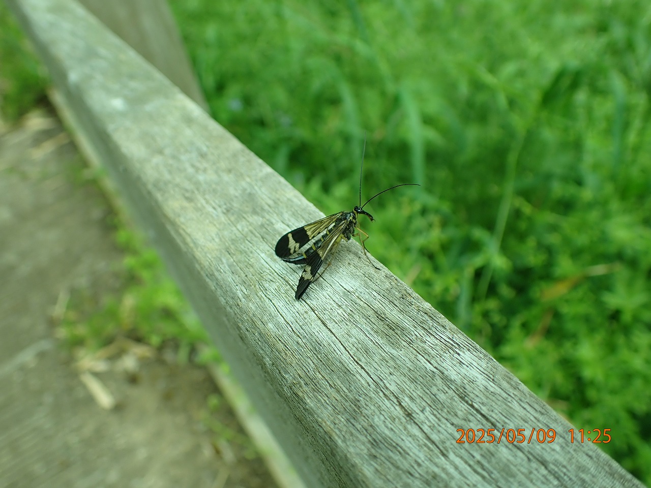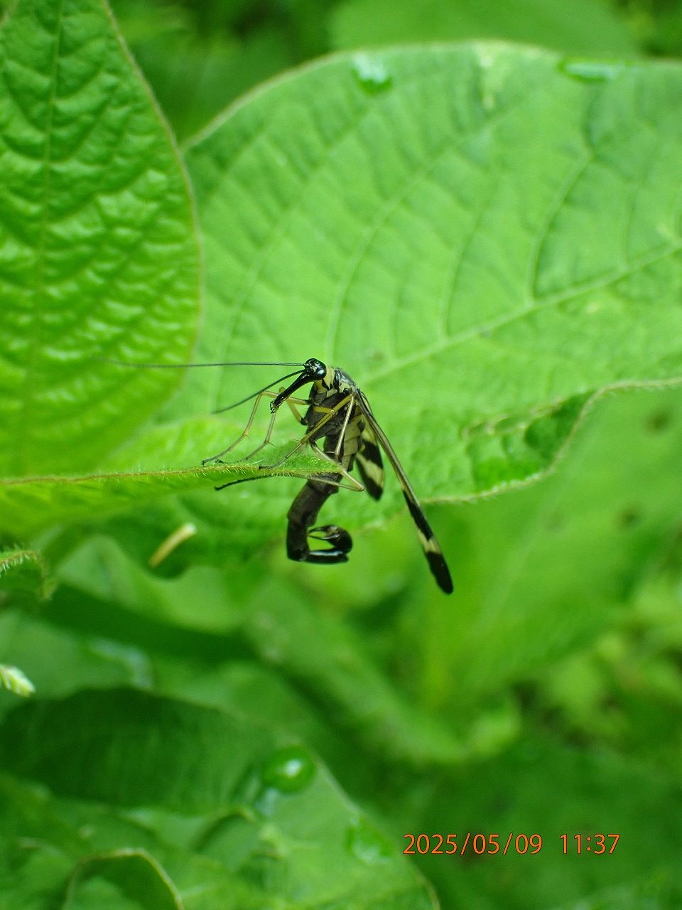 一見ハチのようにも見えるがハチではなく、シリアゲムシ目、シリアゲムシ科に分類される肉食の昆虫で、ヤマトシリアゲという。初夏から現れるちょっと風変わりな奴で、青虫などを狩りしているところもよく見かける。
