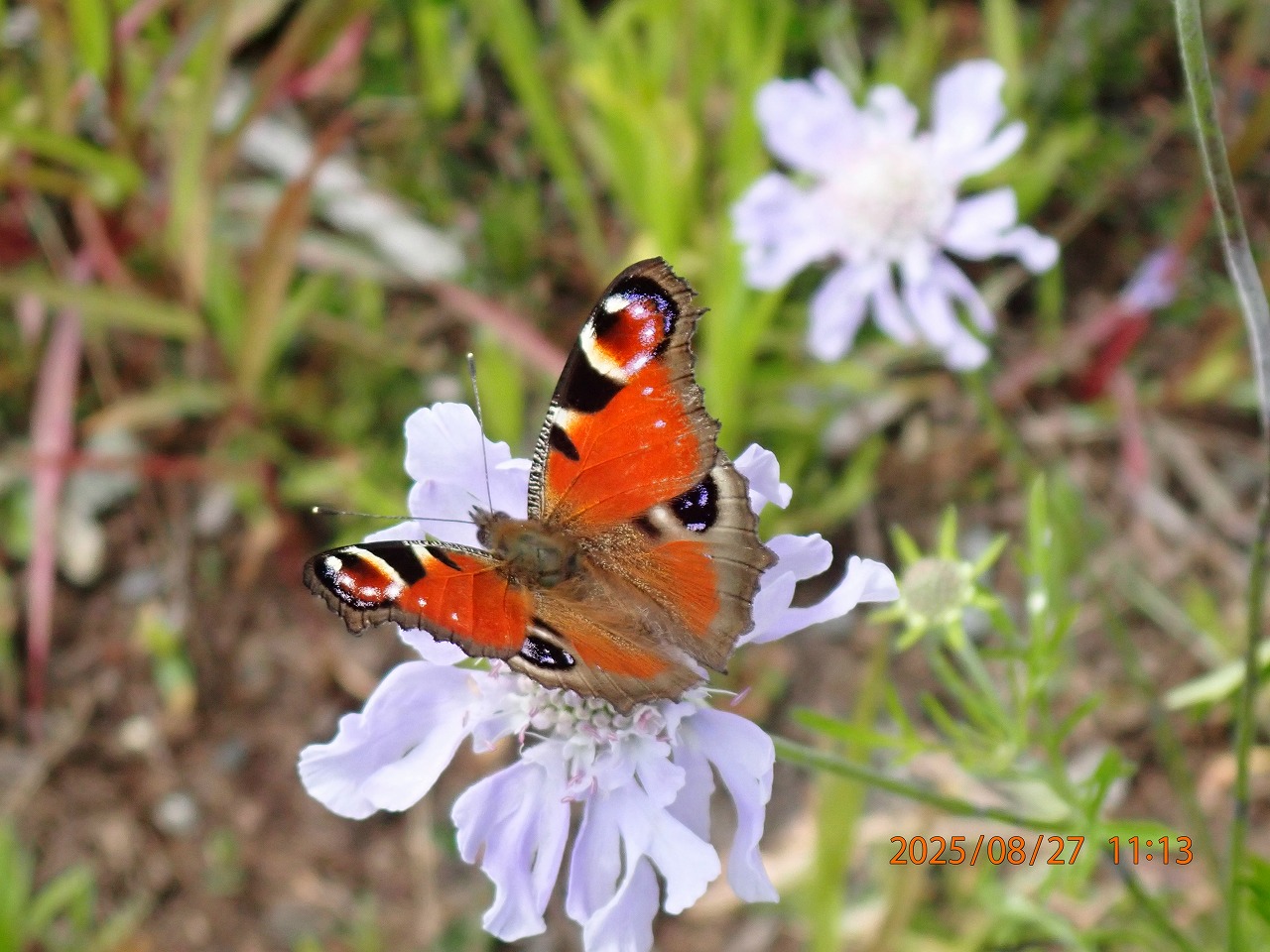 今年はなぜかクジャクチョウのトレードマークである4つの目玉模様が揃って見られる場面が少なかった。前翅だけの二つの目玉だけではちょっと物足りず、しつこく粘った。マツムシソウに止まって4つの目玉を見せてくれるのが一番だが、なかなかそう文句も言えない。今年一番きれいに見せてくれたのが、冒頭の写真、地面に降りた時のものというのも皮肉なものだ。でも、良しとしよう。