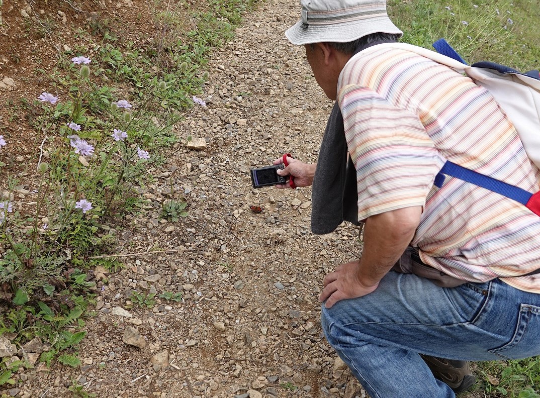 ところで次の写真だが、冒頭のクジャクチョウの写真を撮ろうと地面に降りたところを狙っている私をmatsさんが後ろから一枚。後日送ってもらったが、その時はそのことに全く気付かなかった。いつ逃げられるかとハラハラしながらかなり接近して撮影している。