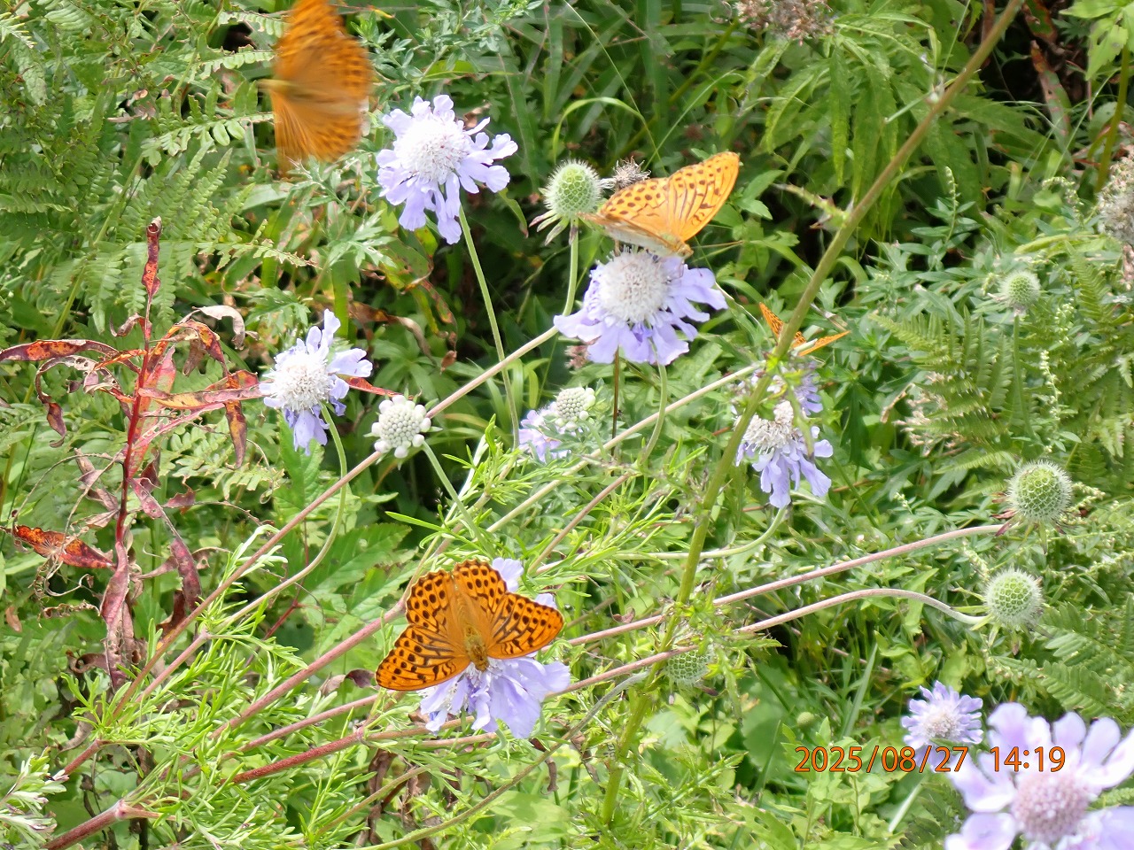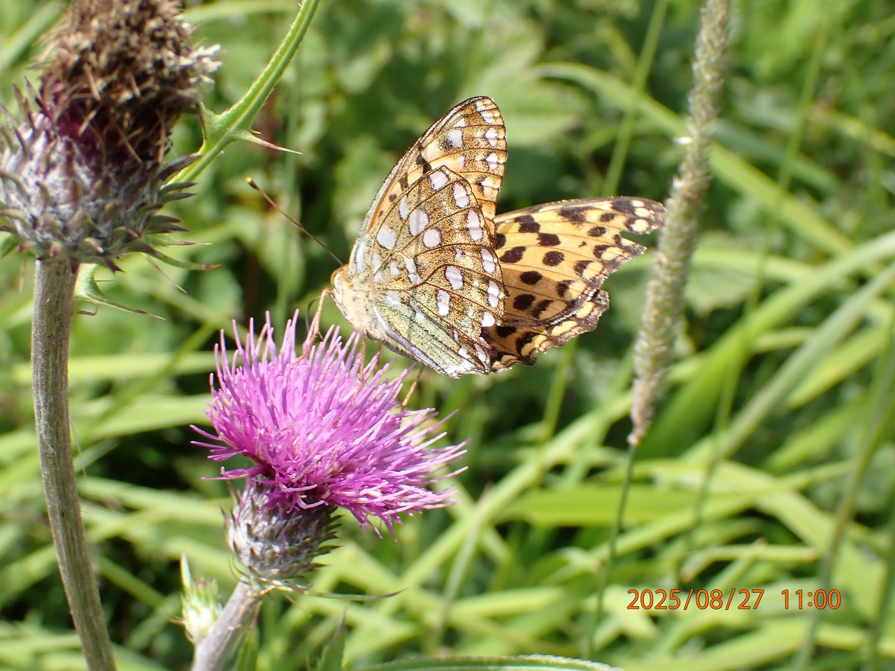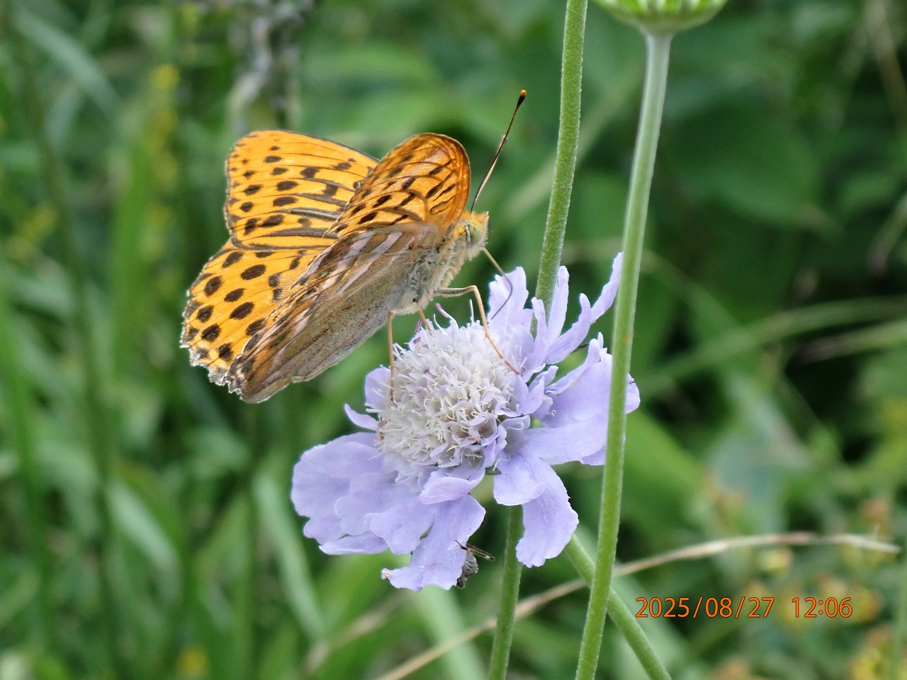 今年も入笠山での滞在時間はそれほど長くなく、10時過ぎに着いて3時頃までの5時間足らず。その間、いろんなチョウたちを見たが、中でもヒョウモン類が最も目立っていた。もちろんそれぞれの発生時期などの関係もあるだろうが、ヒョウモン類が最も活発に飛び回っていた。しかし、今回写真に撮れたのはミドリヒョウモンとギンボシヒョウモンの2種類のみで、ミドリヒョウモンが圧倒的に多かった。以前はウラギンヒョウモン、メスグロヒョウモンなども撮れたので、今回も何頭かはいたはず(?)だが。ともかく、ヒョウモン類は皆非常によく似ているので、止まっている時に翅裏の特徴までよく見極めないと皆同じように見えてしまいなかなか区別が付かない厄介なところもある。
