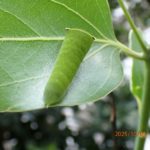 朝ハイム内を散歩していて、ふと足元に目が留まった。そこにはすぐ脇のクスノキから落ちたと思われる青虫が2匹いた。アオスジアゲハの幼虫である。一つはまだ小さく死んで時間が経っているようで黒ずんでいるが、もう一つはそれよりももう少し大きいが落ちてまだ間がないようだ。その日(11月7日)の数日前までは朝晩の気温がぐっと下がっていたので、夜のうちに寒さのため命が尽きたようだ。