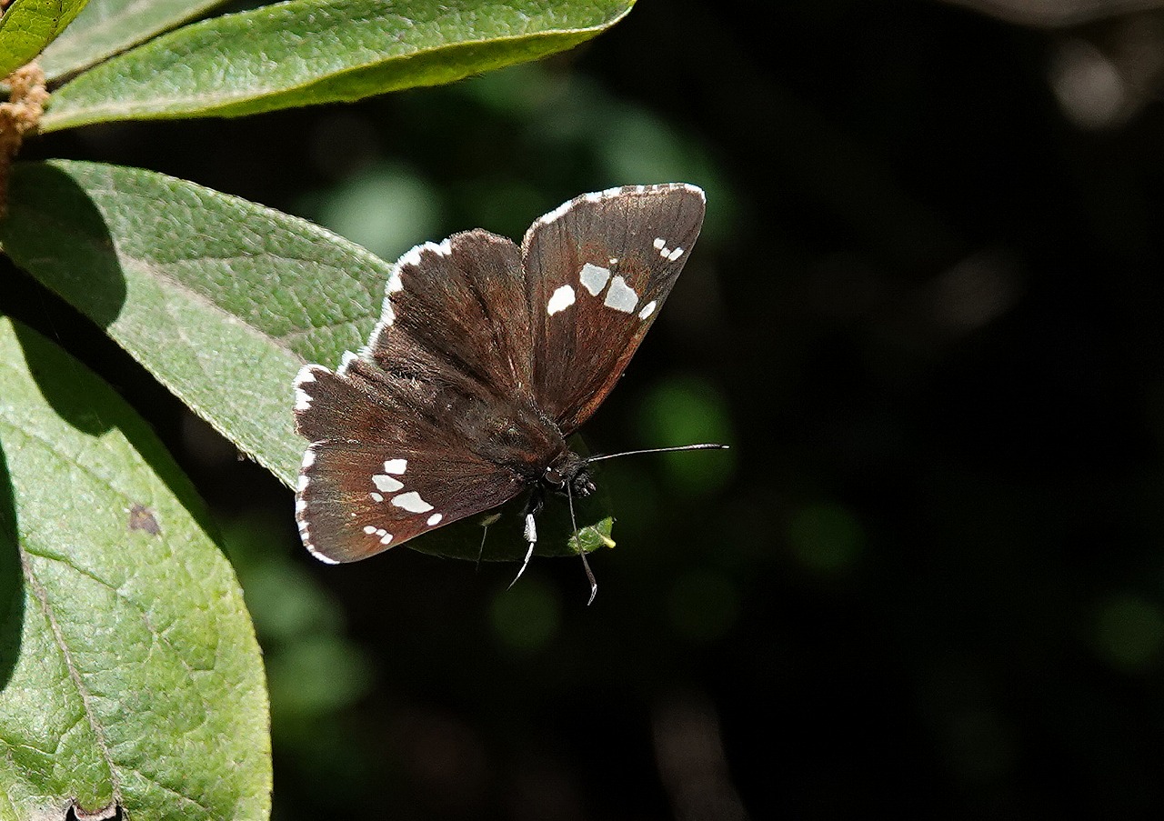 山頂近くで小さいながらテリトリーを張っている(オスが自分の縄張りに同種の他のオス、その他あらゆる生物が侵入すると、時には鳥まで追尾して追い出す)ダイミョウセセリ。なんとなく威厳あり。時折、飛立ち旋回してはまた、元の葉上に戻る動作を繰り返している。「ダイミョウ」は江戸時代の大名の羽織袴の紋を連想させることから付けられたらしい。