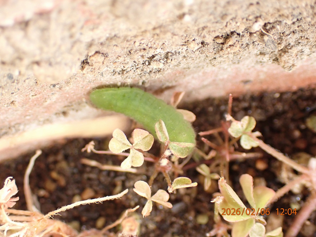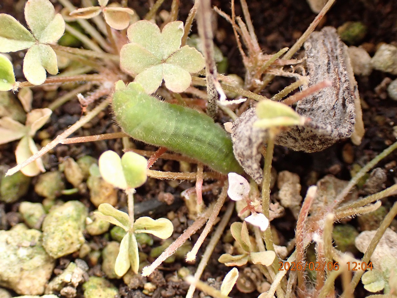 そして、2月6日見たところ、今度は3頭しかいない。しかし、実はそうではなかった。1頭は、ほとんど葉っぱのなくなってしまったカタバミの根元近く地面に張り付いたような形で既に蛹になっていたのだった。「ヤマトシジミは幼虫越冬」であるはずなので、まさかこのタイミングで蛹になっているとは思いもしなかった。昨年末の蛹にも驚かされたが、またもやこの厳冬期に蛹になってしまうとは。
