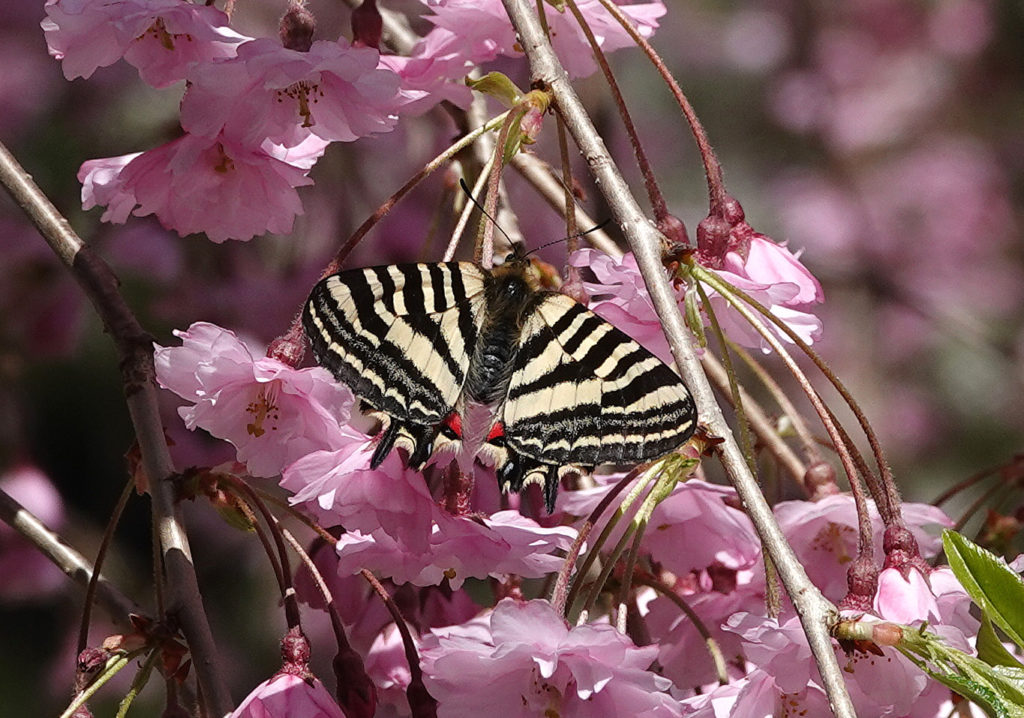 ↓ 枝垂れ桜に飛来するヒメギフチョウ