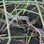 ゴイサギはまだ幼鳥でそれほど大きくはなく模様がホシが散っているように見えることから「ホシゴイ」とも呼ばれる。平和そうに水田を歩き回っていたが、突然スイスイと泳ぎながらアオダイショウが現われて対峙した。どうなることかと息を呑んで見守ったが、双方、同時に警戒モードに入ってゴイサギは恐ろしそうに身を引き、アオダイショウは一瞬の躊躇を経て踵を返してUターン(蛇だけに「きびす」はないですね)して泳ぎ去った。かくして何もおこらなかったが幼鳥でなかったらどう展開したのかは興味深い。ただ、蛇もこのくらいの大きさになると相手が猛禽でもない限り捕食されることはなさそうな気がする。