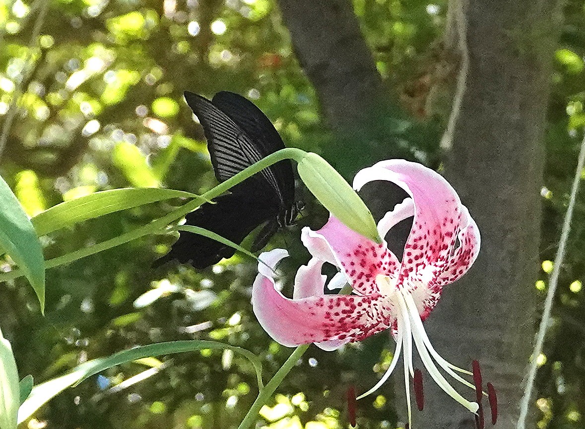 ↓ きっとカラスアゲハ系がくると待っていると、クロアゲハが飛来したのは良かったが・・・花の上からちょこっと吸蜜して飛び去った。下から来てくれないとちっとも絵にならない・・・残念!