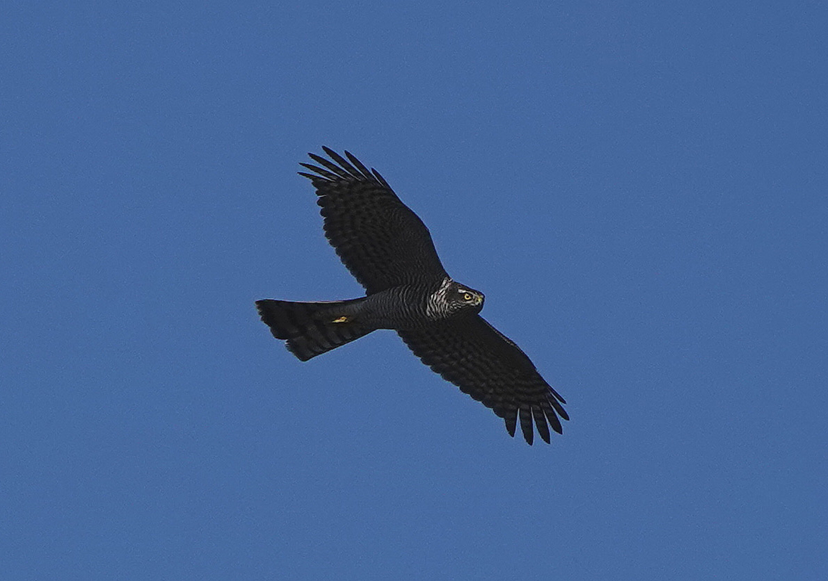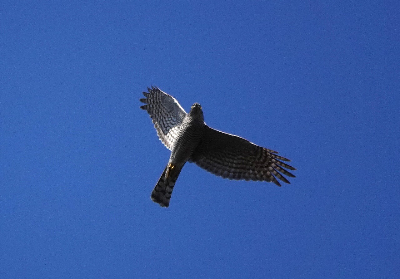 突然、カモたちが一斉に飛び立った、どうしたのだろうと上空を見上げると猛禽が一羽大きく旋回していた。なるほど、これが原因か・・・慌てて望遠をいっぱいにして撮影。撮ってから確認したがオオタカ?よくわからなかったが、帰ってから師匠に確認するとハイタカとのこと。ハイタカは初撮りだ!