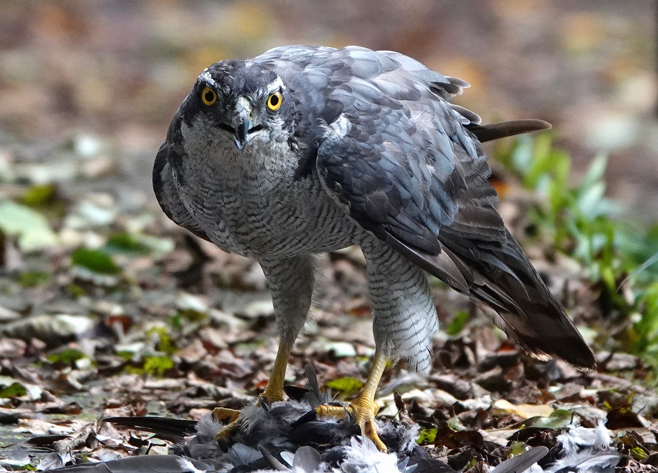 ↓ 市内の緑地で以前に至近距離で撮影した狩の後、食事中のオオタカ (アーカイブ 2022年9月1日 川崎市内)