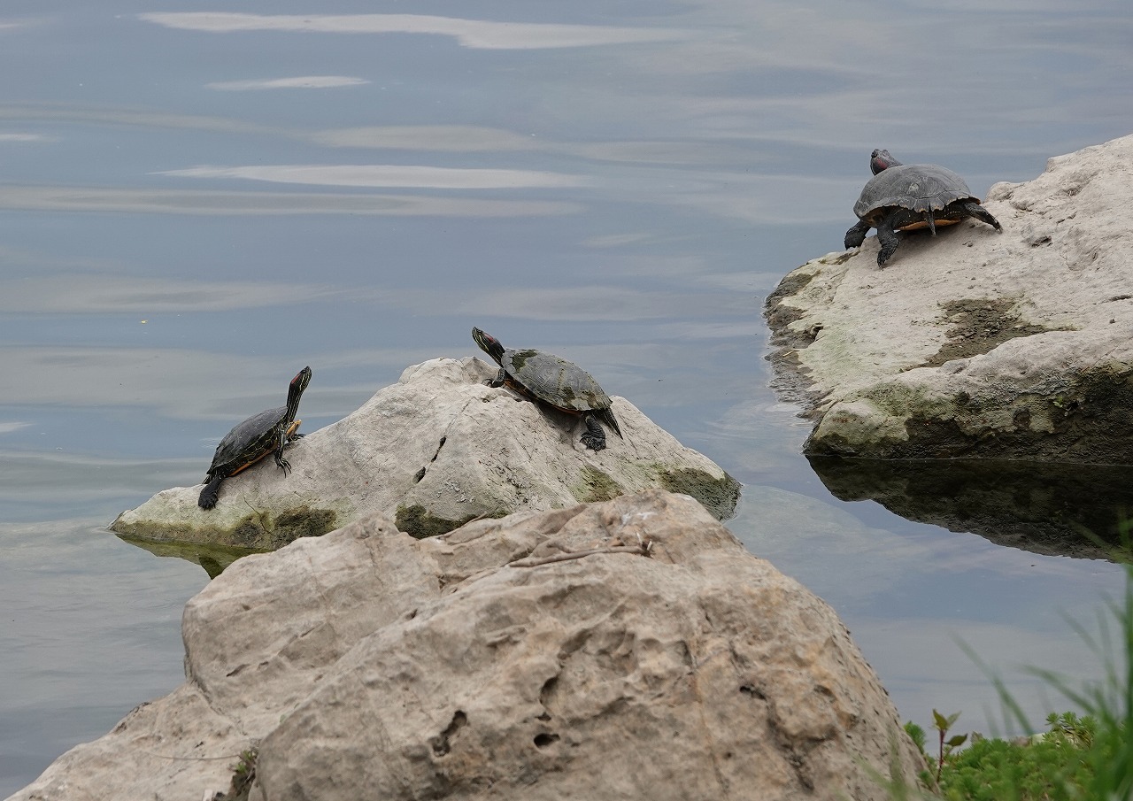 ↓ カメののどかな甲羅干し。ただこのアカミミガメ(ミシシッピアカミミガメ。小さいのが昔、ミドリガメという名で売られていた)はアメリカからの外来種でアメリカザリガニと並んで「条件付特定外来生物」とやらに最近指定された。飼育、譲渡は可能だが売買、野外に逃がすことは禁止・・と、その法律にどれだけの意味があるのかカメやザリガニの繁殖ぶりを目の当たりにして、共に人為的に持ち込まれた生物であることも考えると殆ど意味のない後追い感しかない