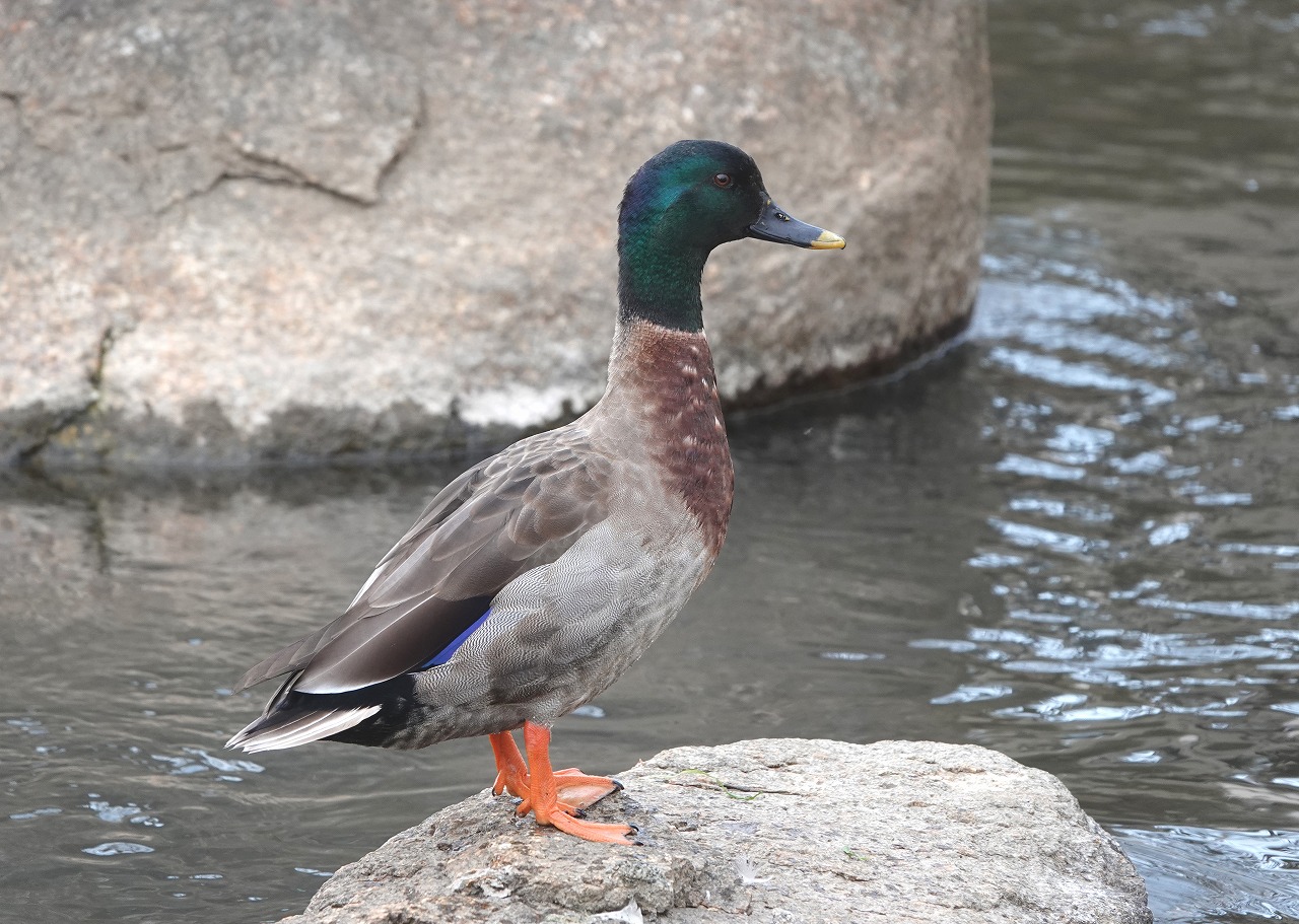 ↓ マルガモのオス 頭部・胸部はマガモ、嘴はカルガモ (アーカイブ 二ヶ領用水 2022年2月14日)