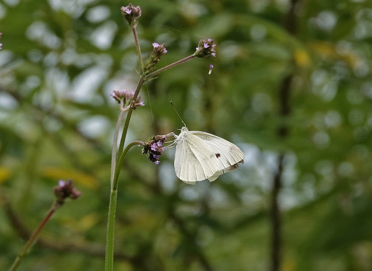 ↓ これも帰化植物。一大勢力になるアレチハナガサで吸蜜するモンシロチョウ