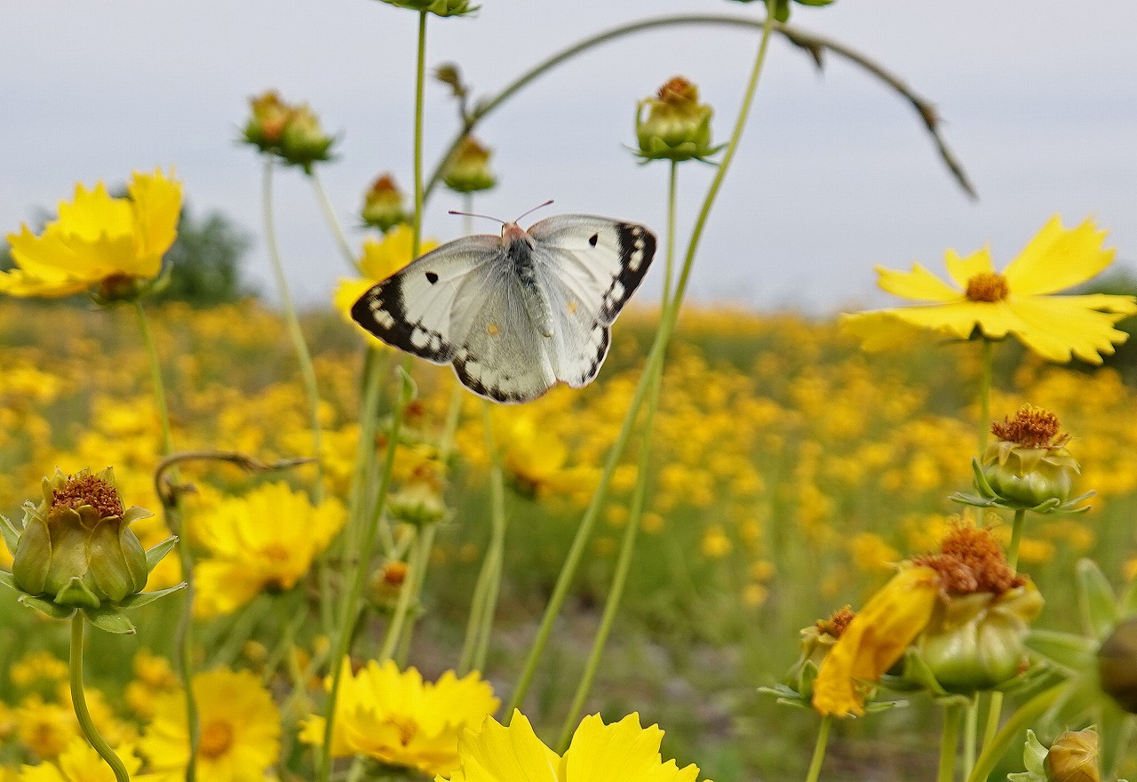 ↓ モンキチョウ(メス) オオキンケイギクの海を飛ぶ