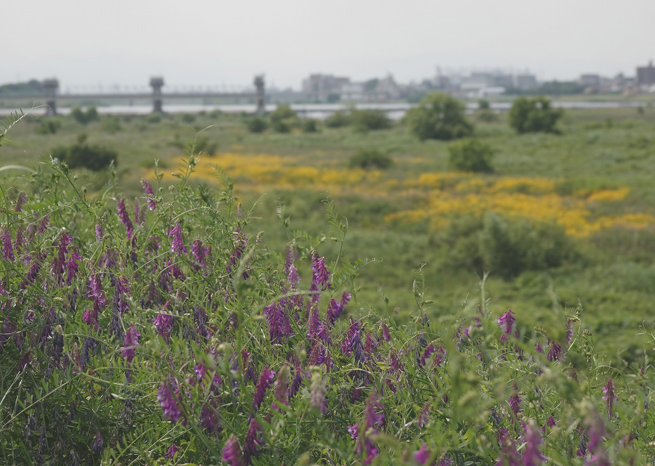 ↓ ナヨクサフジ(紫)とオオキンケイギク(黄) いずれも帰化植物