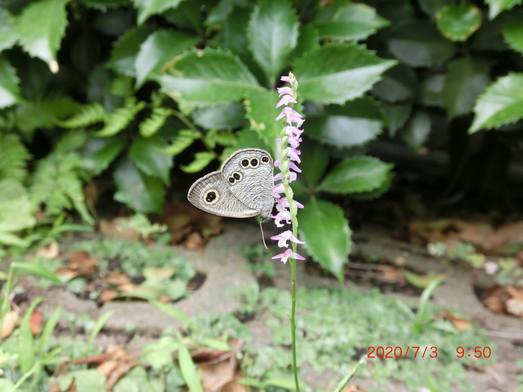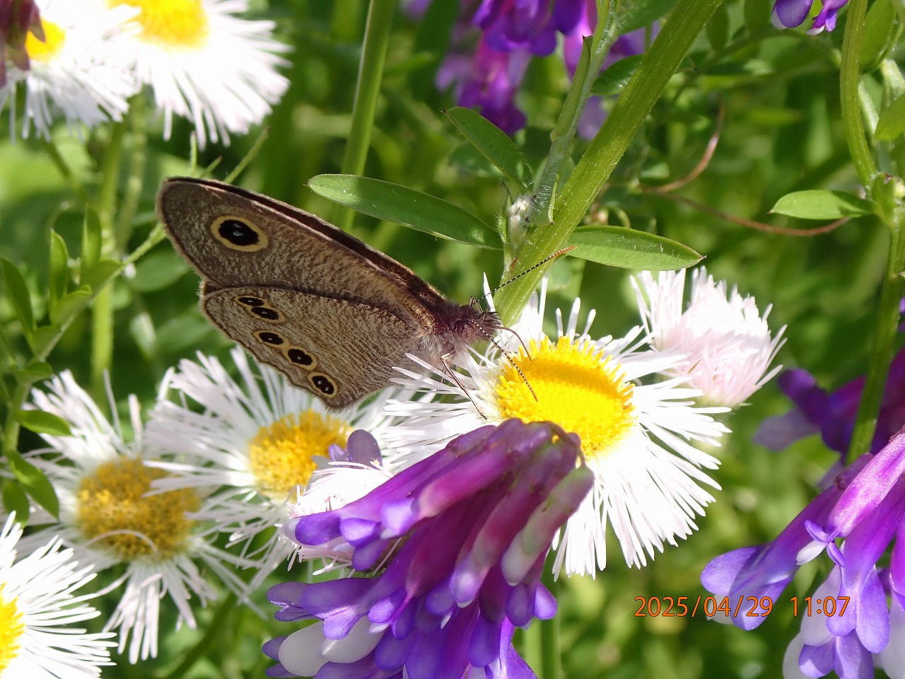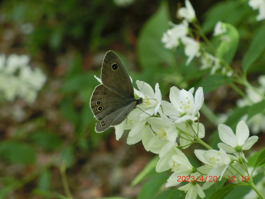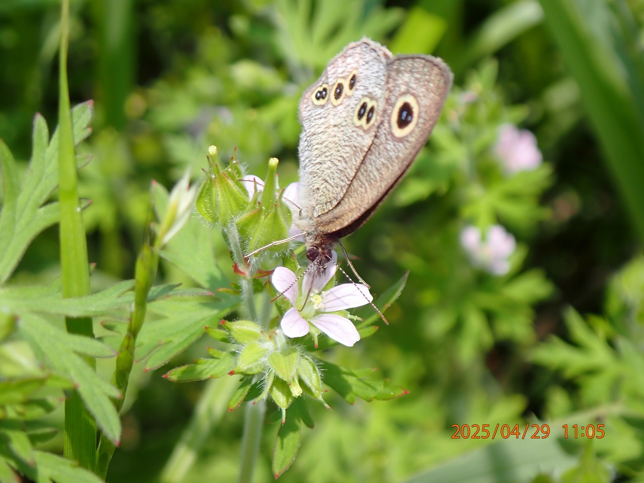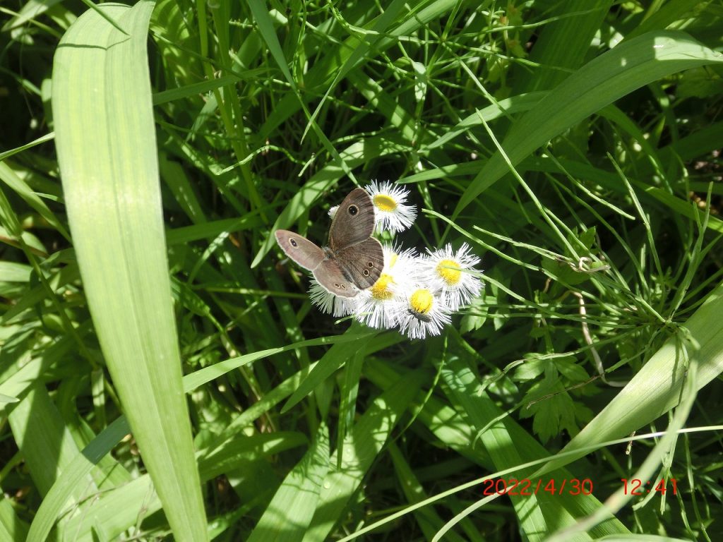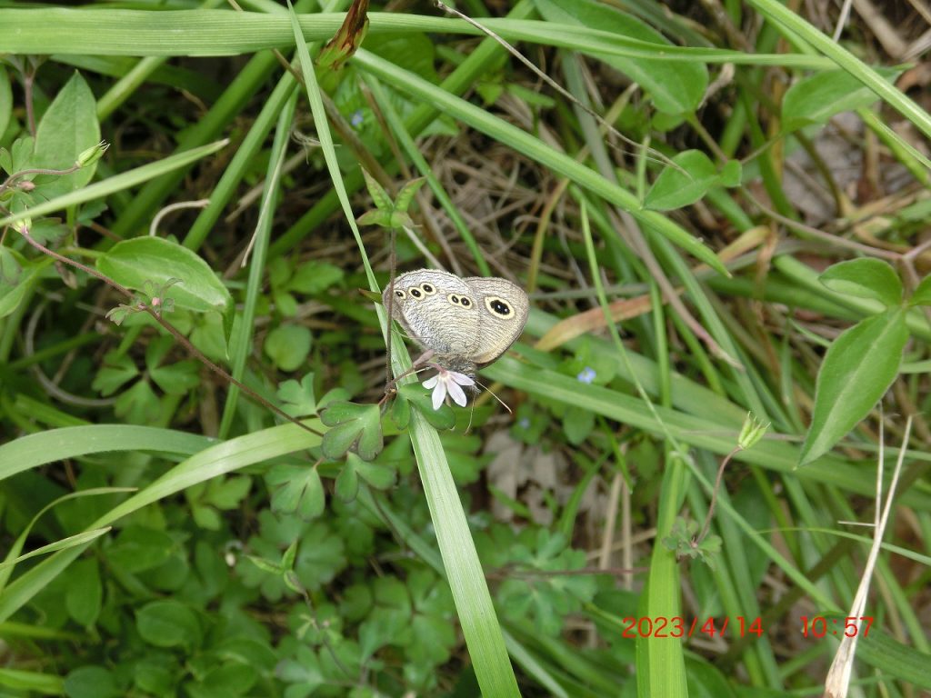 茂る草の間を低くヒラッヒラッと飛び回るヒメウラナミジャノメ。草に止まっては時折翅をパッパッと開いて翅表の目玉模様を見せる。そんなヒメウラナミジャノメはモンシロチョウなどのように風に乗って軽やかに花から花へ蜜を求めて飛び回るという印象はなぜかしら薄い。そこでこれまでに撮った写真を調べてみたところ、意外にもいくつもの吸蜜する姿を撮っていたことに今更ながら気付いた。どれも小さい花で蜜を吸っている。やはりチョウだ、当然と言えば当然のこと。