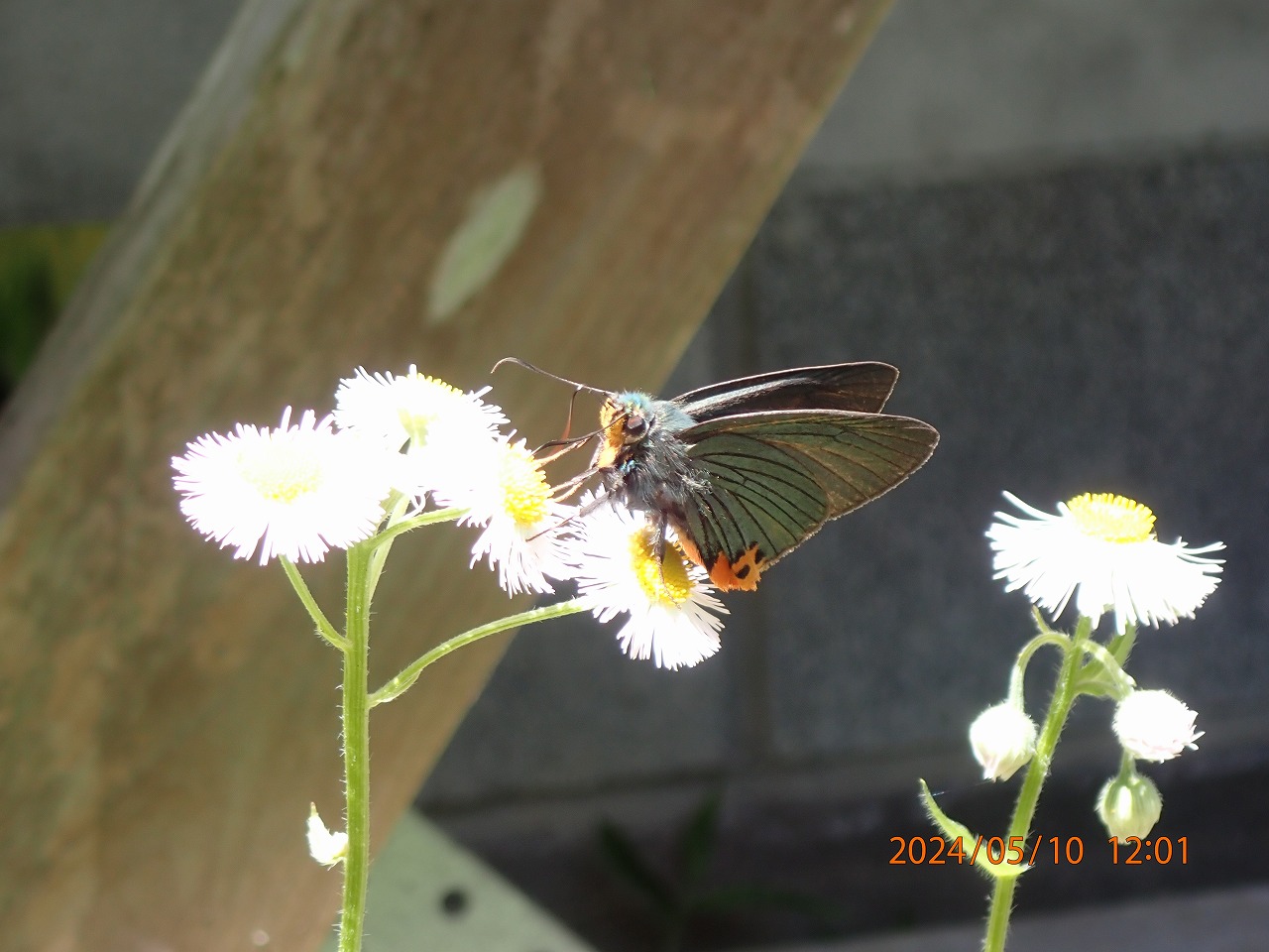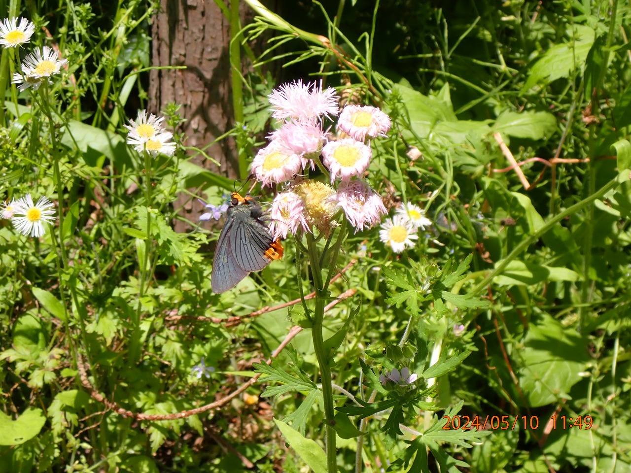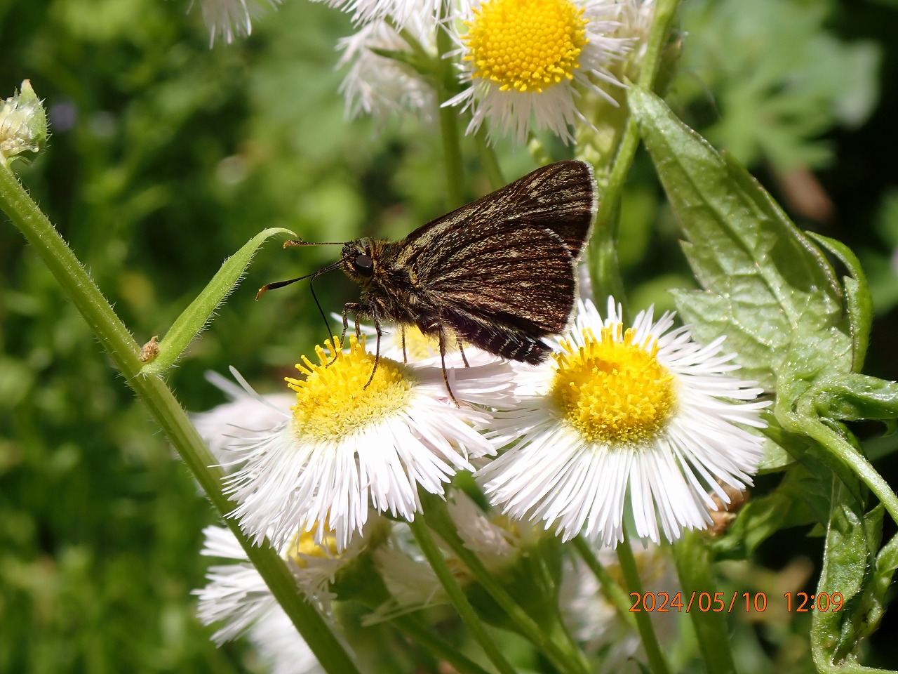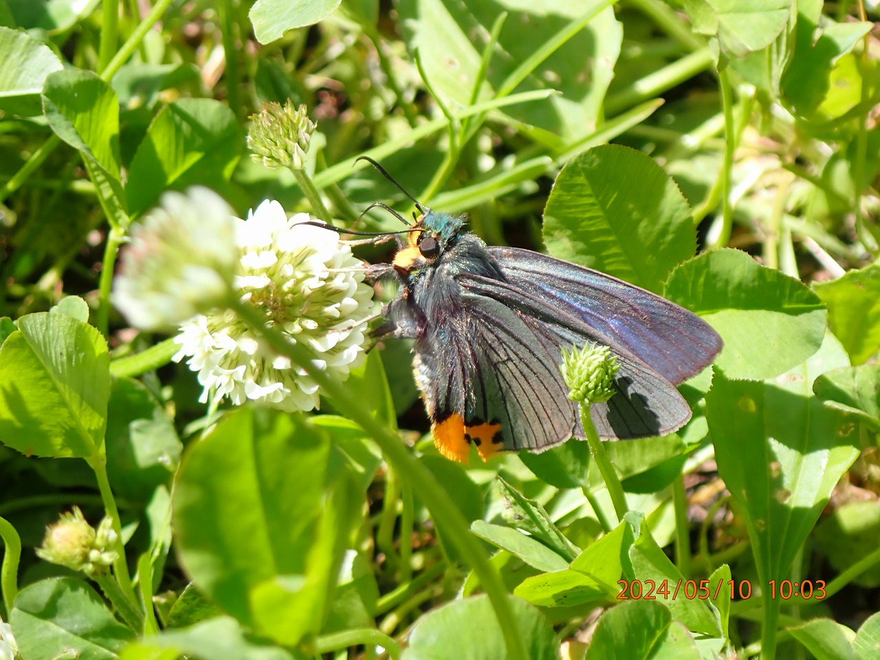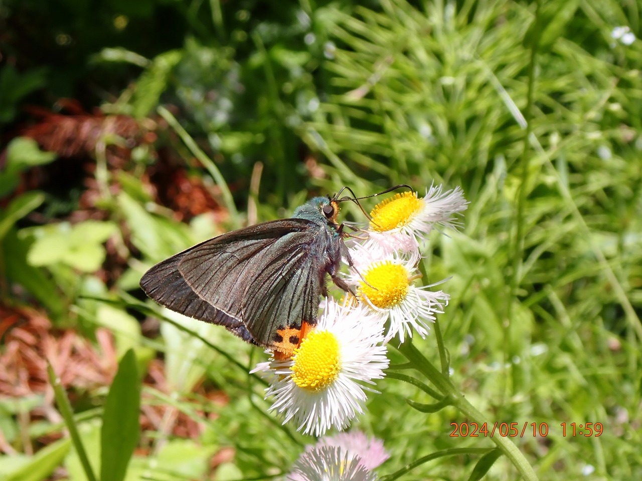 ということで、まだチャンスがあるだろうと思い裏高尾に行ったが、例年ならまだ咲いているはずのそこのヒメウツギは今年はもう完全に終わっていた。あたりにはハルジオンが咲き残っているくらいで、殆ど目ぼしい花はない。しかし、数年前にヒメウツギが終わった後のハルジオンで撮ったことがあったので、しばらく待っていると期待通りに来てくれた。ただ、アオバセセリの体重でもハルジオンの花は大きく首を傾け、なかなか翅の青さが見えるようには止まってくれない。ああでもないこうでもないと、ちょうどいいアングルを探しているうちに、あっという間にどこかへ飛び去る。だが、このアオバセセリは辺りを巡回しているようで、また20分ほどすると帰ってくる。今度は踏みつけられたシロツメグサの花にも止まり吸蜜する。この光景は初めて見た。