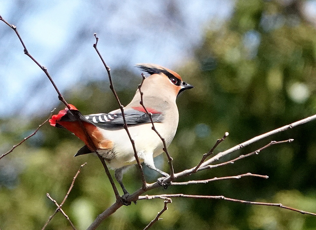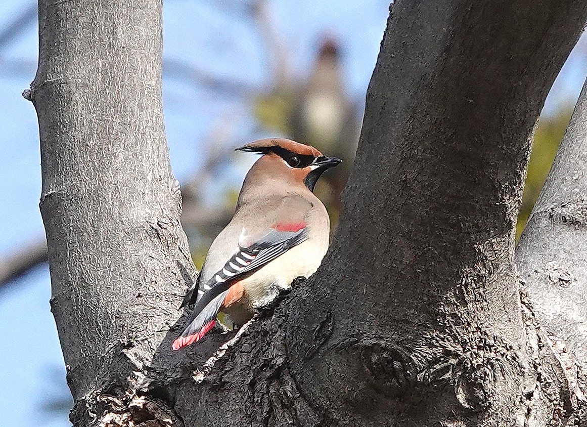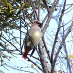 因みに、このあと突然、全羽(20~30?)が群をなして飛び去った。ふと気がつくと上空では猛禽(タカの類)が一羽旋回していた。ヒレンジャクが群をなすのはこれらの天敵に対して身を守るためと言われている