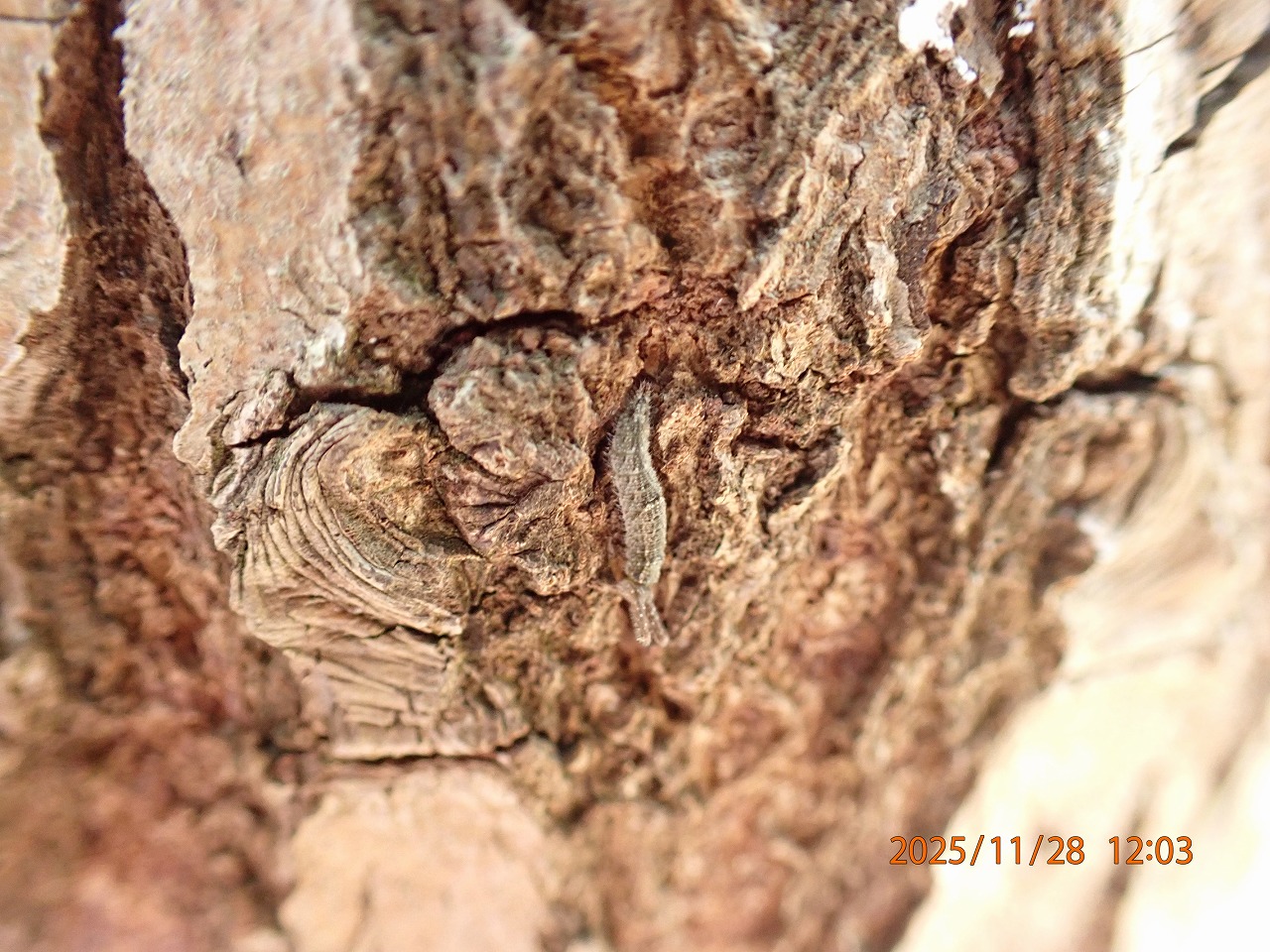 これは何の変哲もない幼虫の写真に見えますが、実は2年越しで狙っていた場面です。体長1cmほどの小さいコムラサキの幼虫がヤナギの幹を4-5mの樹上から地上1m前後のところまで延々と這って降りてきて、越冬をするのに適した樹皮の割れ目を探しているところです。この後、わずか30cm程度の距離を1時間以上かけて探し、ついに気に入った場所を見つけて越冬態勢に入りました。