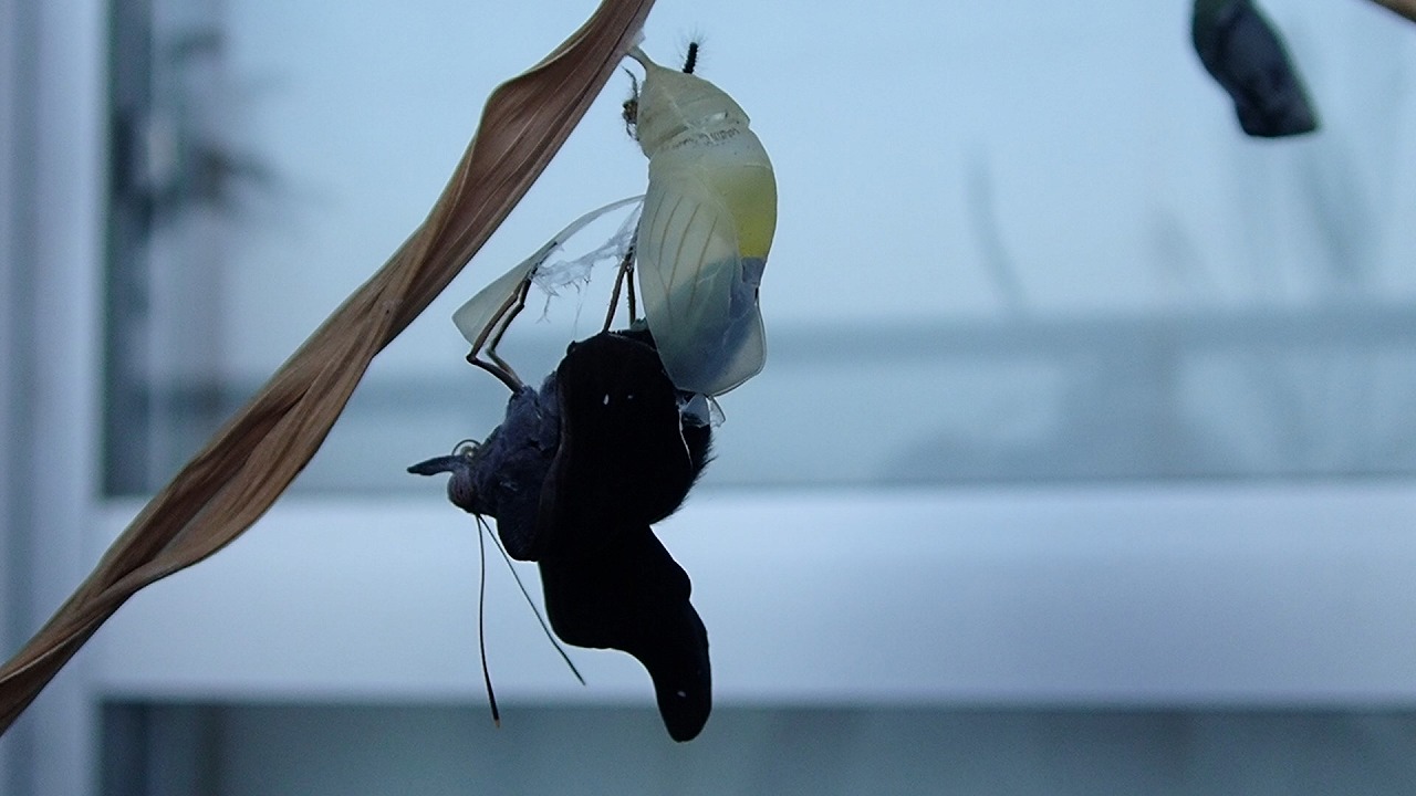 飼育中のジャコウアゲハが幼虫時代の黒いナマコのような皮を脱いで蛹に変身する瞬間です。背中側が割れて、中から黄色い蛹が覗き始めています。