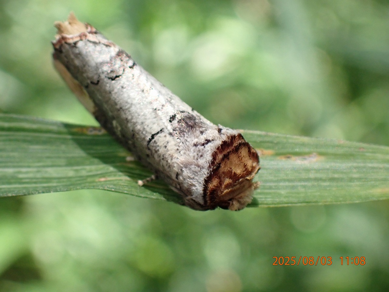 擬態にもいろいろな擬態がありますが、これは折れた小枝に擬態したツマキシャチホコという小さな蛾です。草の葉の上に折れた小枝がチョンと乗っているように見えたのですが、実はそうではありませんでした。体全体が灰色の木の樹皮のようで、しかも先端は折れた木の小口に似せ年輪を思わせる模様にまでなっており、後端は折れた木の感じもうまく出しています。体長わずか2cm程度の小さな体にこれほどの絶妙な細工が施されている、なんという擬態の妙でしょうか!