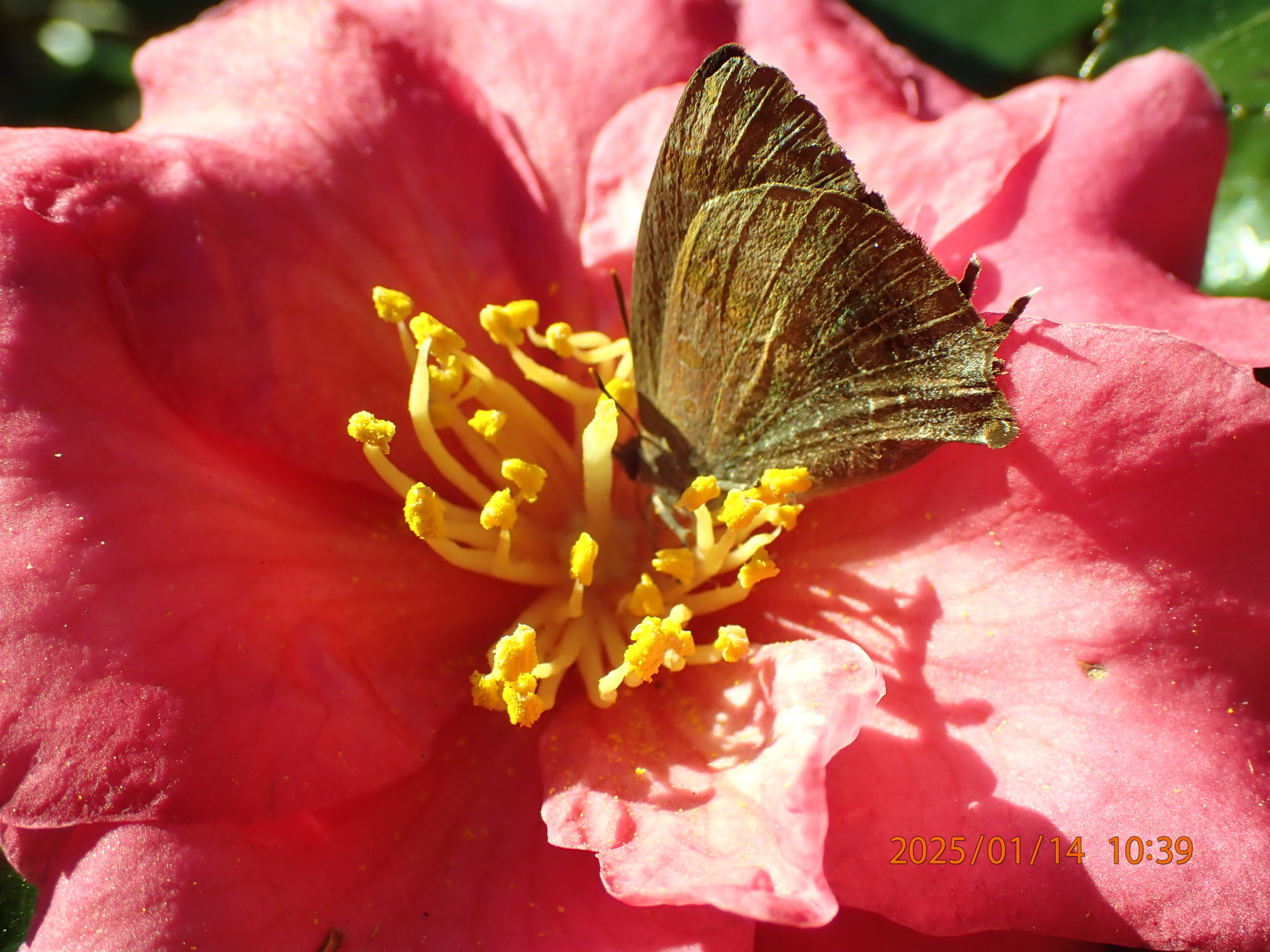 空気は冷たいいものの日差しの暖かさを感じるこの日、ムラサキツバメはサザンカの花に体ごと入って吸蜜していました。真冬の時期には樹液の出ている木もないし、花の数も少ないので、日向に咲くサザンカなどはありがたい食事場所です。このあと、太陽に背を向けて大きく翅を広げ、暖をとっていました。