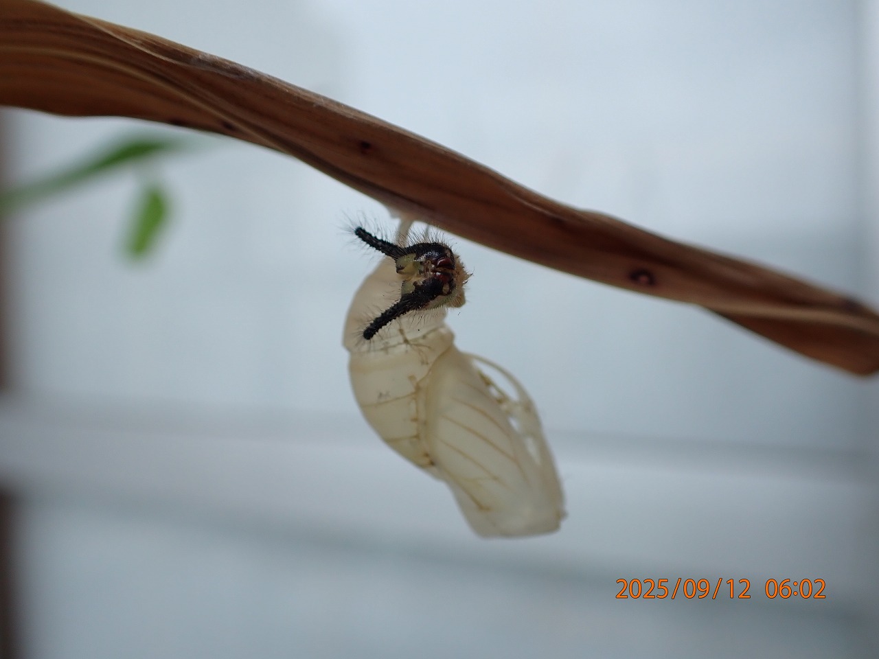 この個体は蛹になる時に頭部の抜け殻だけが蛹に付いたままでした。普通なら、体の部分の抜け殻と一緒に頭の部分も切り離されて蛹からは落ちるものなのですが、なぜかずっと蛹に付いたままでした。羽化の瞬間の写真も、よく見ると蛹の反対側の上の方に触角の一部が写っているのがわかります。