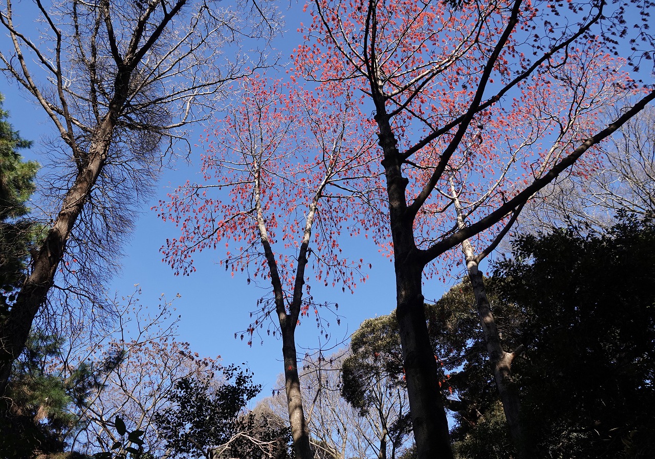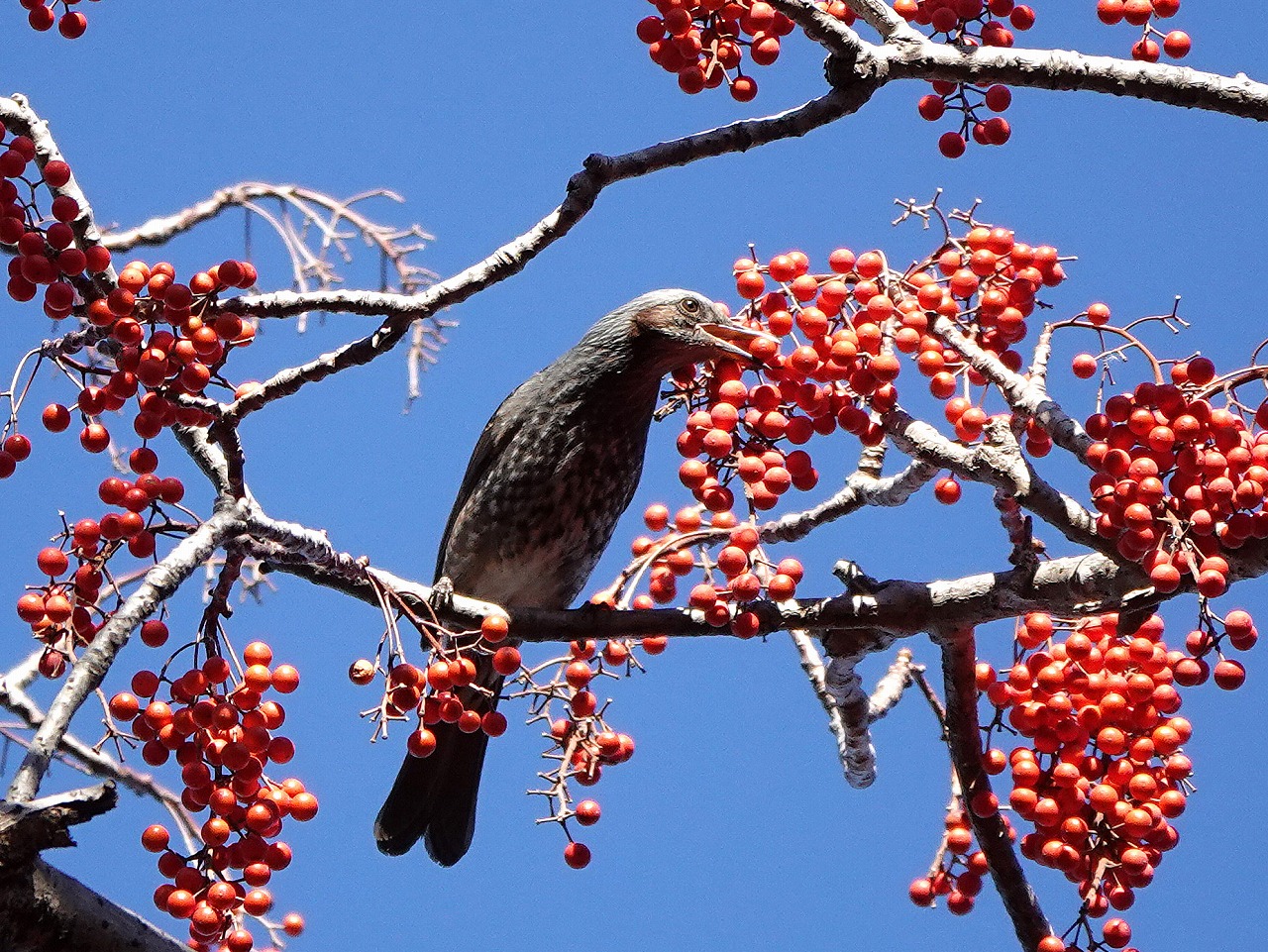 ↓ 園内には既に落葉し橙の実を残すだけとなったイイギリの高木が散在している。これにヒヨドリが騒がしい声をあげながら飛来しているのは見えてはいたがどれも周囲の木の枝が邪魔して撮れなかった。ただ、歩くうちにスッキリしたイイギリが見つかったのでその下で暫く待っていると期待通りにヒヨドリが飛来し実を啄みだした。これがトップの写真。 ↓ スッキリしたイイギリ。橙の実が青空に映える