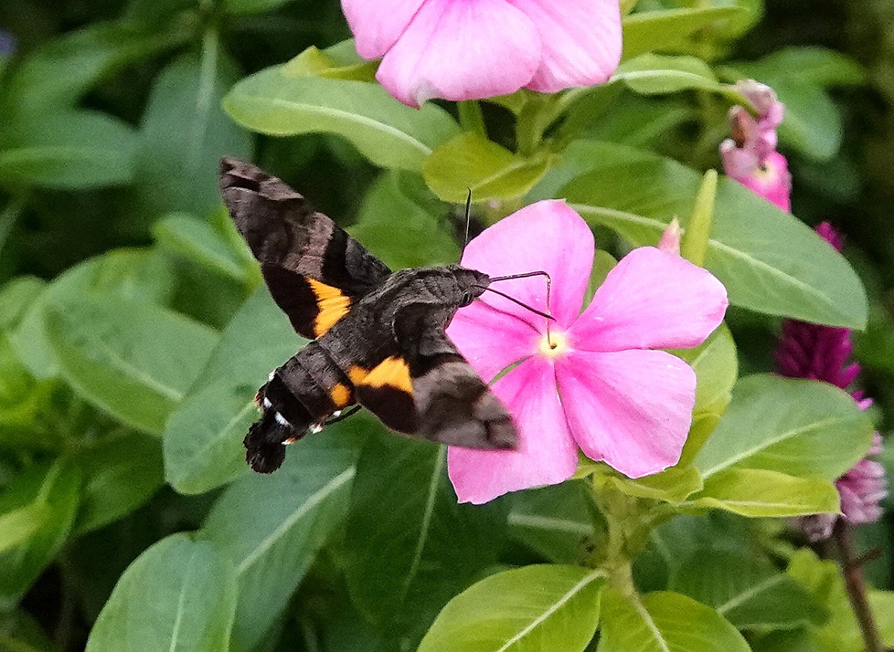 ↑ 生田緑地。ホバリングしながらニチニチソウに口吻を差し込む、何と器用な!