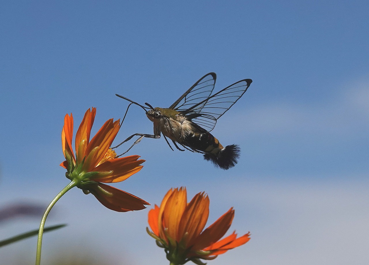 ↓ もちろん、ツリフネソウ以外でも吸蜜する。ホバリングしながら器用に口吻をニチニチソウの小さな穴に差し込んでいる (アーカイブ 2022年10月11日 生田緑地)