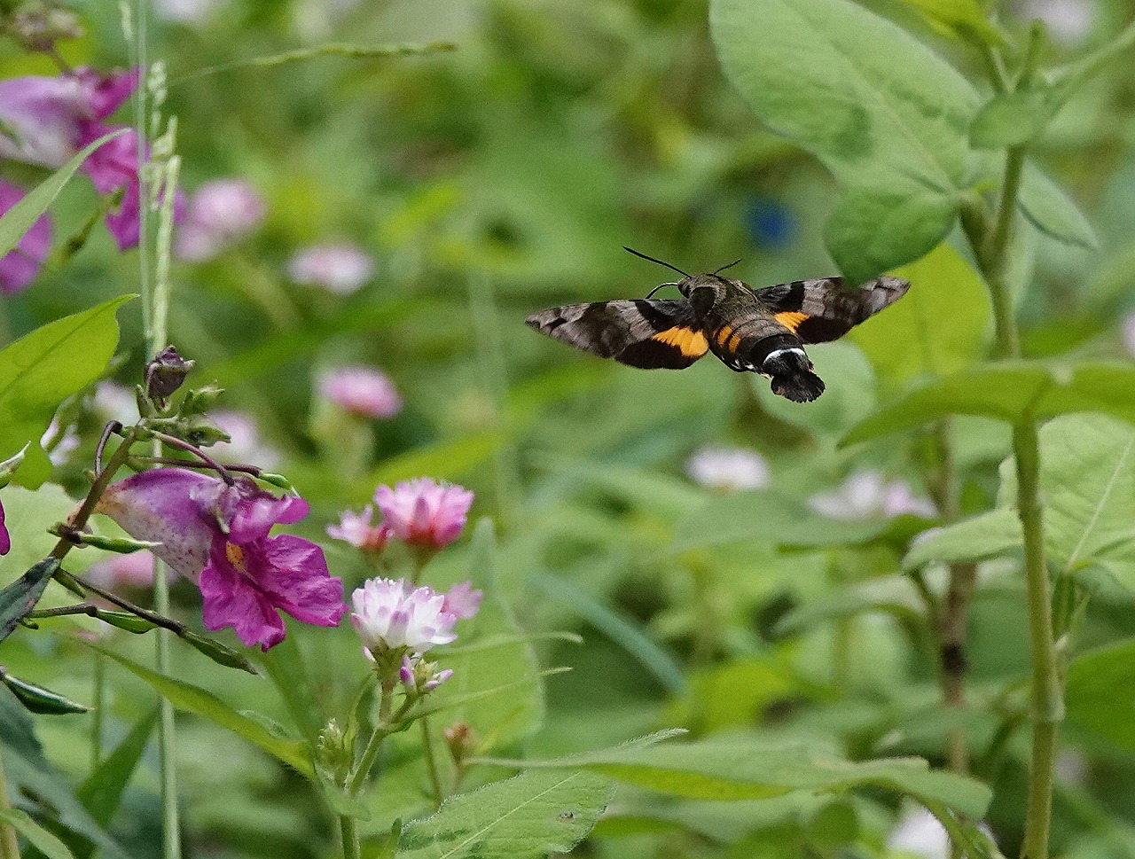 花に向かって急接近しているホシホウジャク。昼行性のスズメガで活発に花から花へと飛び回り、花の前に近づくとホバリング状態で、或いは花の中に頭を半分突っ込んで吸蜜する。花に潜り込まれると全身が見えないし、いかにも不格好なので花に近づいた瞬間を狙うとゼンマイ型の口吻も伸びていて迫力が出る・・・と理屈でわかってはいても実際には相当速いのでスポーツ感覚でたくさん撮ってピンボケを量産している。