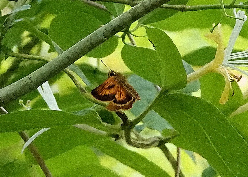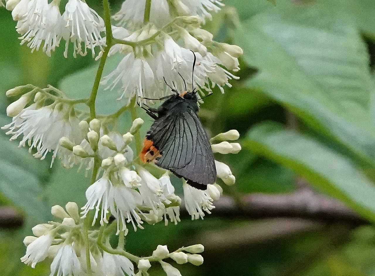 ↓ みんな目撃だけで撮れなかったアオバセセリが解散後の帰りのバス停付近のオオバアサガラで吸蜜していた。何人かで歓喜の内に撮影達成
