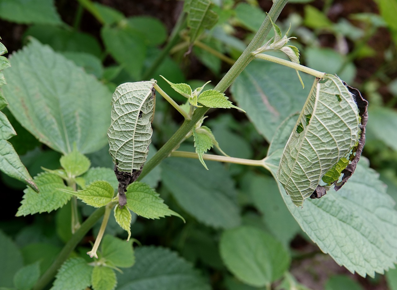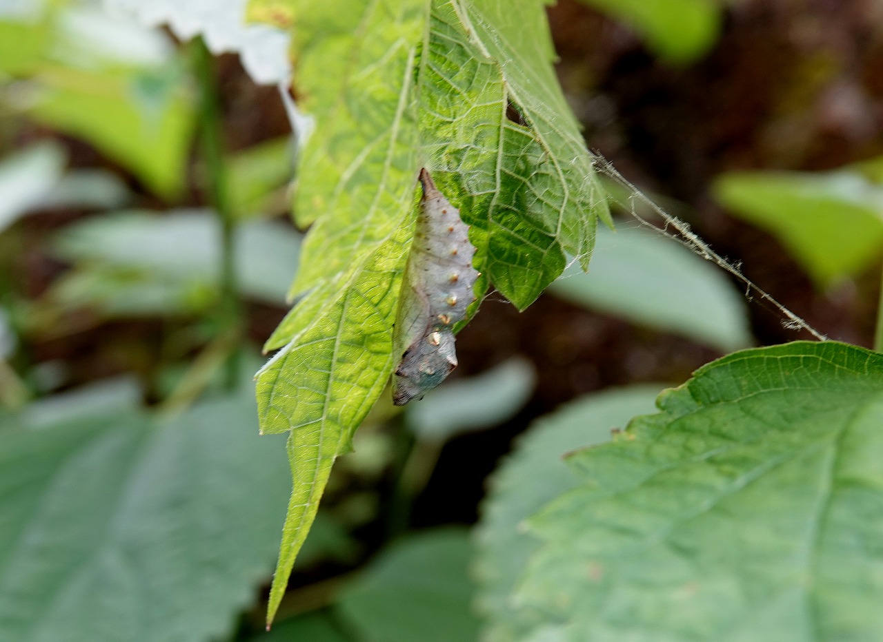 カラムシの葉を丸めているのはアカタテハ、開いてみると、幼虫がいたり、また、蛹になっているのもいたが、蛹は葉を丸めずにそのままぶら下がっているのもいる。黄金に煌めく不思議な突起が目を惹く