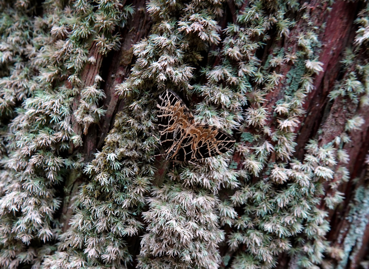 相棒のHenk氏(同じく会員です)と参加したが生憎の曇り空にも拘わらず小学生から高齢者まで約50人が参加した。裏高尾の木下沢(こげさわ)、日影沢を数時間かけて見つけた蝶の記録を取りながらゆっくりと進んだ。気温も余り上がらないので蝶を含め昆虫の活動はにぶい。トップは小学生が見つけた苔むした幹にとまるキアミナミシャク(おそらく)、極めて繊細にデザインされた模様、でもよくこんなのを見つけるものだ・・・