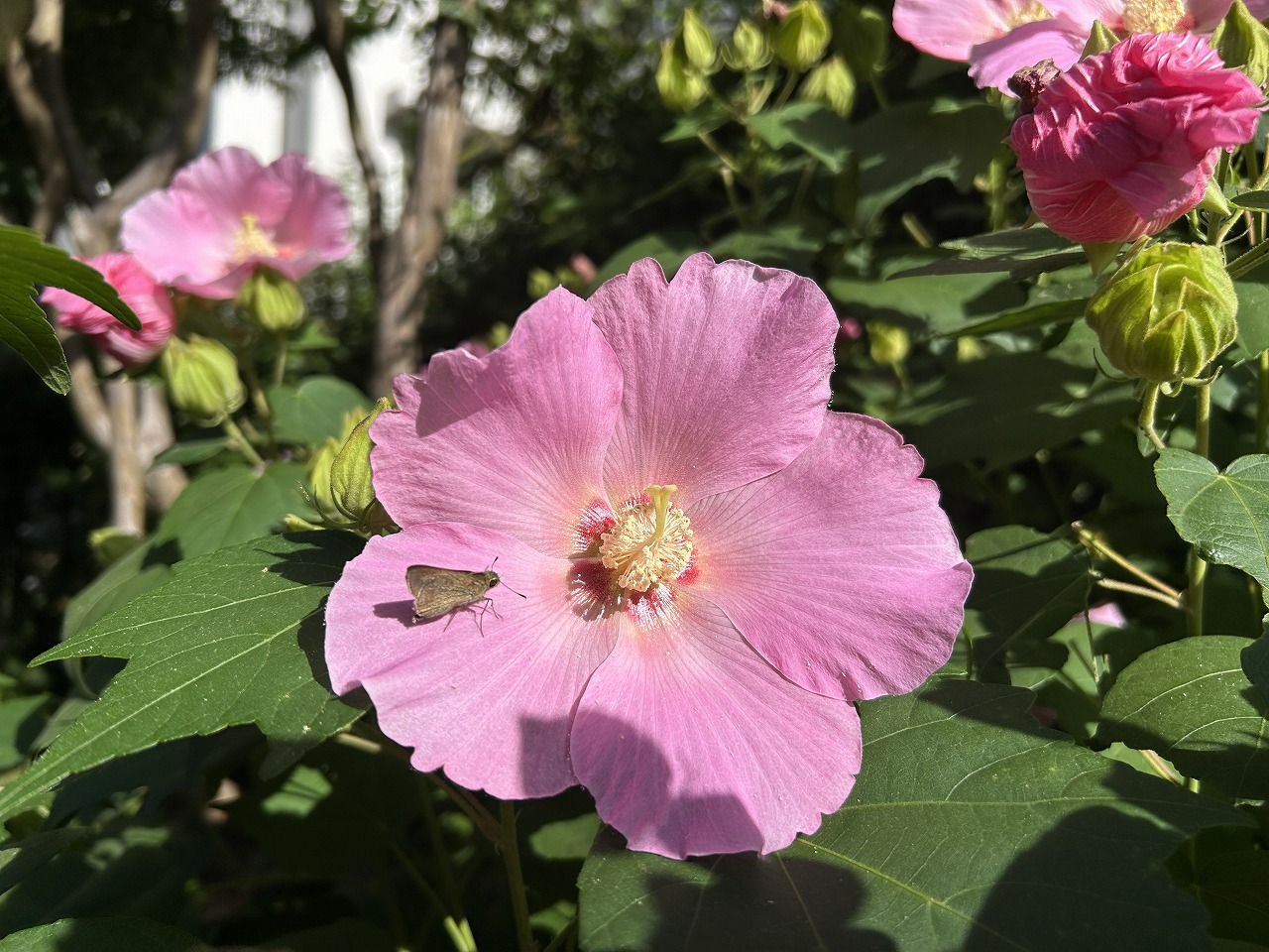 朝、ごみ捨ての途中に芙蓉が咲いているのでちょっと観察するとイチモンジセセリが懸命に(?)飛び回りながら吸蜜していたのでスマホで撮影。「花と蝶」の優雅なイメージとはちょっと異なり、胴太・翅小で飛翔は優雅さなくす速い。小学校の時にその幼虫がイネを食すので「害虫」と習った。モンシロチョウだって同じく幼虫がキャベツを食すので害虫。一方、先日紹介したセナガアナバチ、これはゴキブリに寄生してやっつけるので「益虫」とされているらしい、なんと一方的な決めつけ方か・・・食物連鎖の頂点に位置する(ほんとかな?必ずしもそうでないという説もあるらしい)人間目線ではあるが、食われる方の生物から見ると人間は害虫、いや害生物・天敵だろう。閑話休題、好き嫌いなくいろいろな花を訪れるイチモンジセセリを害虫だと思って見たことは中学生以降皆無ではある。