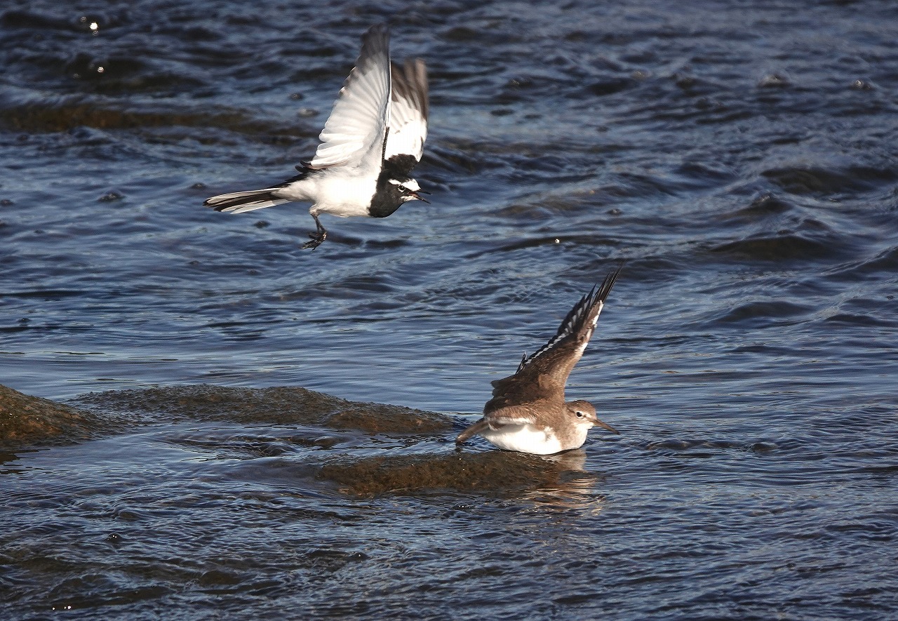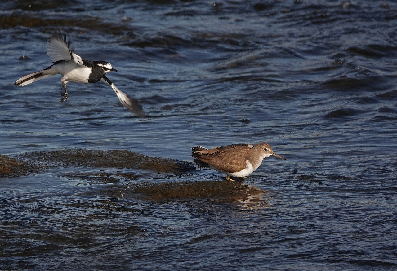 ↓ 背後よりセグロセキレイが迫る。ただセキレイのエサは小さな虫やミミズで他の鳥を襲ったりはしない。