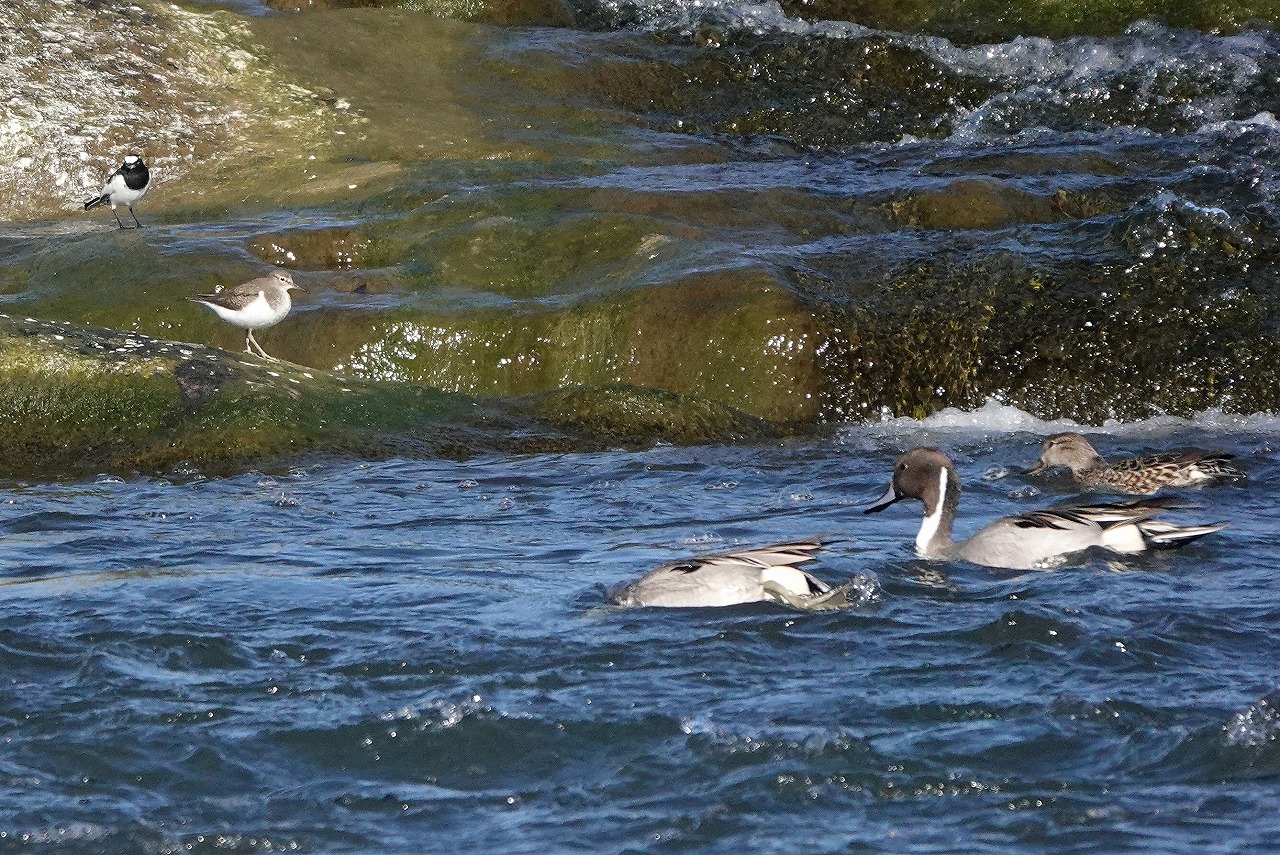 ↓ 流れの対岸にも姿が見えたが同じように捜し物のスタイル。手前にオナガガモ、後方にセグロセキレイが見える