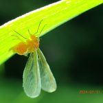 いつもこの時期になると出会うオレンジ色の面白い奴。イネ科の植物にいることが多く、一度見たら忘れられない。初対面の時もそうだったが、二度目以降もこの何とも言えない目の表情には愛嬌があり、思わず吹き出しそうになってしまう。しかも、この目はどの角度から見ても中心に寄ってこちらを見つめているように見えるのである。名前をアカハネナガウンカというウンカの仲間で、体長は3-4mm程度の小さな虫だが翅は体に比べかなり長い。ともあれ、この写真を拡大してとくと表情をご覧頂きたい。